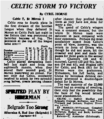 TWO – SATURDAY 15 NOVEMBER 1947 – “Firhill for thrills” is a phrase much used in Glasgow, and today it lived up to this tag with a fine eight goal thriller in which Celtic come off best with a 5-3 victory in spite of being 0-2 down and later 1-3 down.