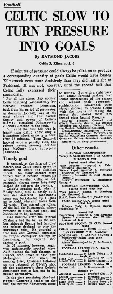 FOUR – WEDNESDAY 15 NOVEMBER 1967 – Celtic continue their recuperation (although the repercussions continue) from their South American misadventure by beating Kilmarnock 3-0 tonight at Celtic Park. Bertie Auld, John Hughes and Stevie Chalmers score the goal in a game in which they had to fight very hard and to show some patience especially after Chalmers scores another goal after referee Mr Kelly declines to play the advantage rule after a defender has handled.