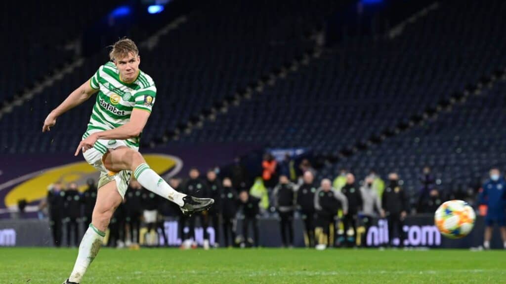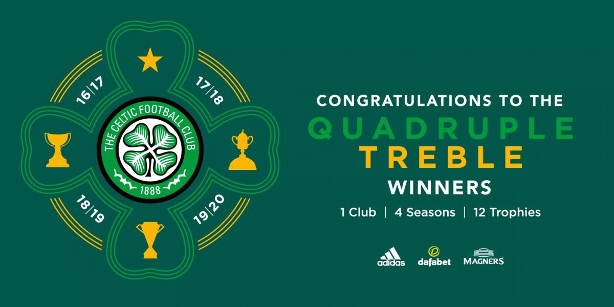 FIVE – SUNDAY 20 DECEMBER 2020 – It is the most bizarre Scottish Cup final of them all. Covid restrictions have compelled it to be played in front of an empty stadium on the eve of Midwinter’s Day. It is unreal, but Celtic win the Scottish Cup for the 40th time in a penalty shoot out against Hearts who deserve a lot of credit for their comeback after Celtic were 2 up at half time with a goal from Ryan Christie and a penalty from Odsonne Edouard. Then in extra time after Leigh Griffiths scores, Hearts come back again. The Celtic hero was the little known goalkeeper Connor Hazard who saves two penalties in the shoot out before Kristofer Ajer scores the crucial one. Thus in more or less unbelievable circumstances, Celtic win their 40th Scottish Cup and their Quadruple Treble.