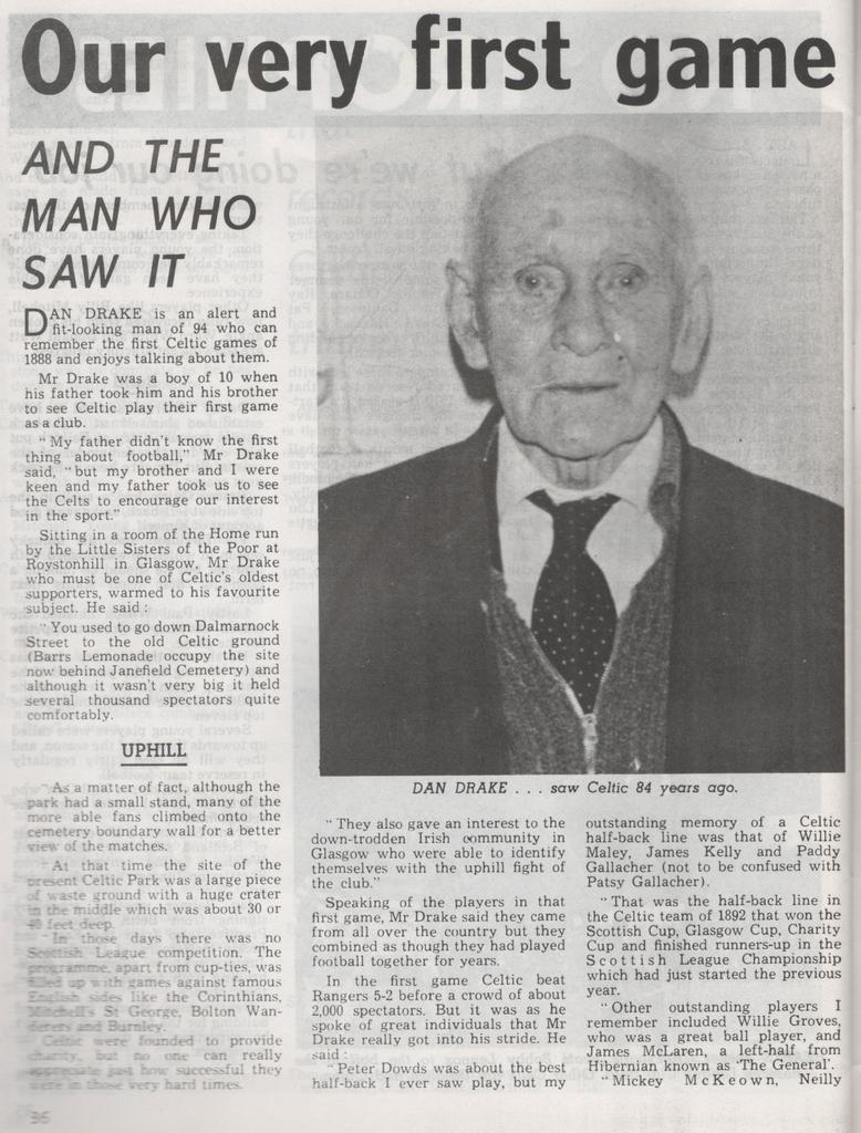 The supporters name was Dan Drake and he was 94 years old when the Celtic View interviewed him. According to ‘Uniquely Celtic’ by Frank Rafters, Dan was one of six children. Born in 1878, unlike his siblings who were all born in Glasgow, Dan is recorded as being born in England, though no exact details of location are given.