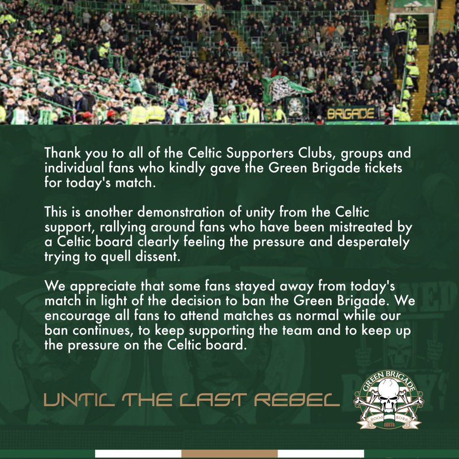 “Thank you to all of the Celtic supporters clubs, groups and individual fans who kindly gave the Green Brigade tickets for today’s match. This is another demonstration of unity from the Celtic support, rallying around fans who have been mistreated by a Celtic board clearly feeling the pressure and desperately trying to quell dissent.
