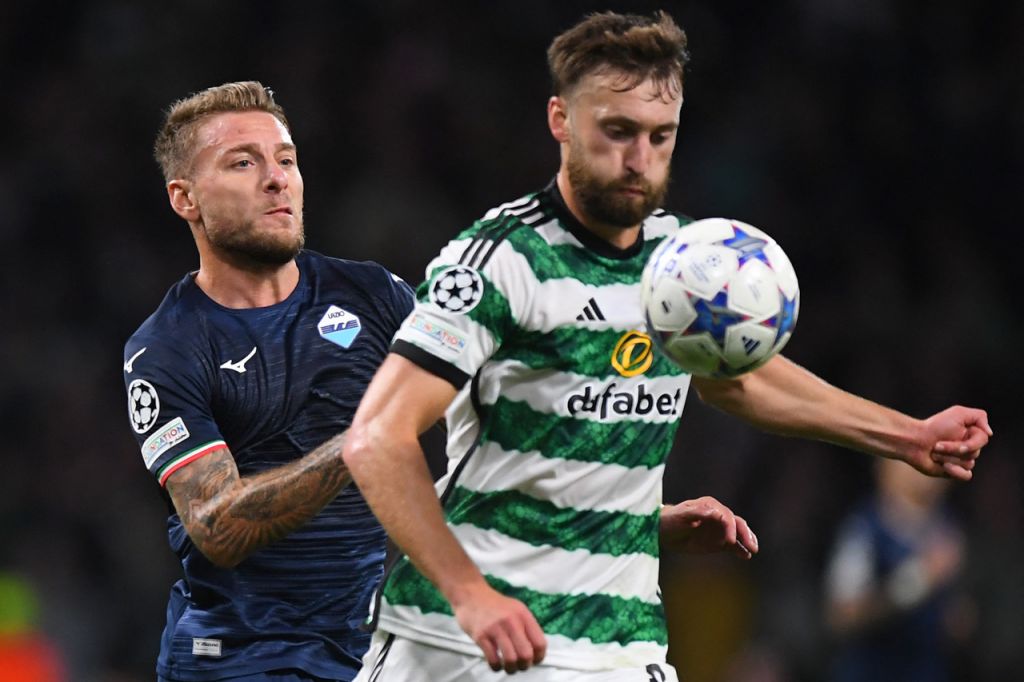 Lazio’s Italian defender #13 Alessio Romagnoli and Celtic’s Honduras striker #07 Luis Palma vie for the ball during the UEFA Champions League group E football match between Celtic and Lazio at Celtic Park stadium in Glasgow, Scotland on October 4, 2023. (Photo by ANDY BUCHANAN / AFP) (Photo by ANDY BUCHANAN/AFP via Getty Images)