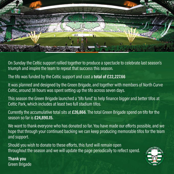 “This season the Green Brigade launched a tifo fund to help finance bigger and better tifos at Celtic Park, which includes at least two full stadium tifos. Currently the accumulative total sits at £26,866. The total Green Brigade spend for the season so far is £24,890.15.