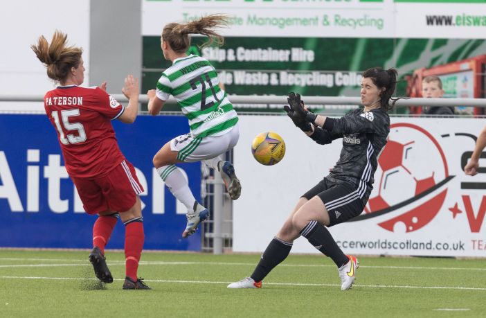 And it was new signing Charlie Wellings who caught the eye in a first half that although started cagily, soon descended into one way traffic. Indeed the only real blip was a bullet header from captain Kelly Clark that flew past Rachel Johnstone in the Celtic goal to level an encounter at 1-1 in a game where, bar Aberdeen Penman’s superb cross that forced Clark to score an own goal, Aberdeen barely laid a glove on the Hoops.