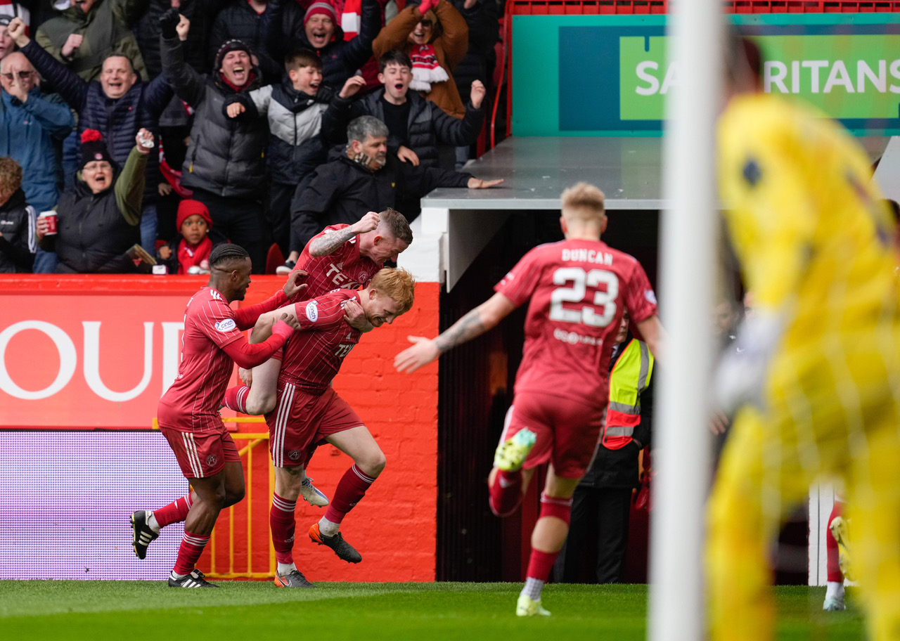 Photo by Stuart Wallace/Shutterstock. Celtic’s on loan defender Liam Scales scores for Aberdeen and celebrates with team mates after his long range looping effort beat theRangers veteran goalkeeper Allan McGregor to give Aberdeen a 1-0 lead. Aberdeen v theRangers, Cinch Scottish Premiership, Pittodrie. Aberdeen won the match 2-0.