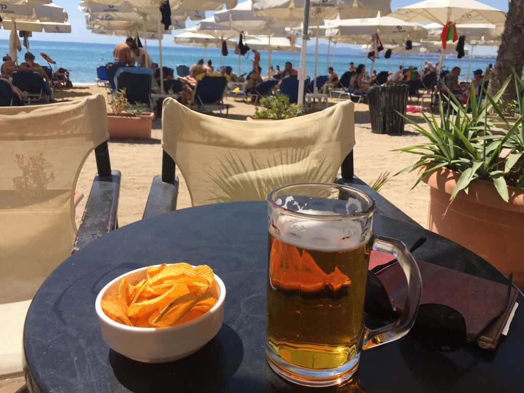 Quick wash and change and suddenly I’m doing a Paul Buchanan, with a walk across the rooftops. There’s a couple working the bar but only a few patrons. I compliment the barman on the music, it’s Pink Floyd, Queen then the Beatles. He says that’s because I’m British. I point out that I’m actually Scottish and the response is ‘Oh that’s much better!’. He is an AEK supporter and is very friendly. Think I’m going to like it here.