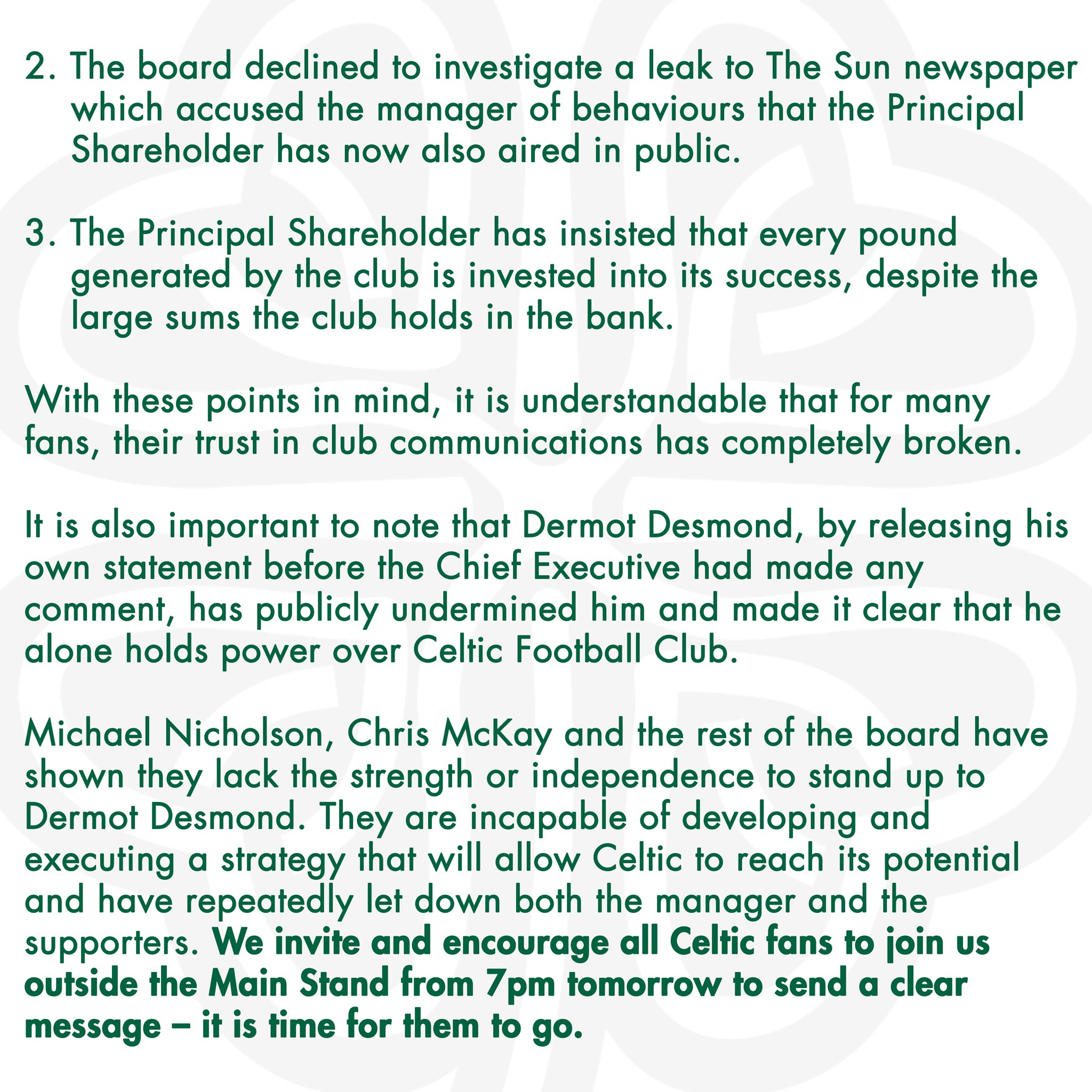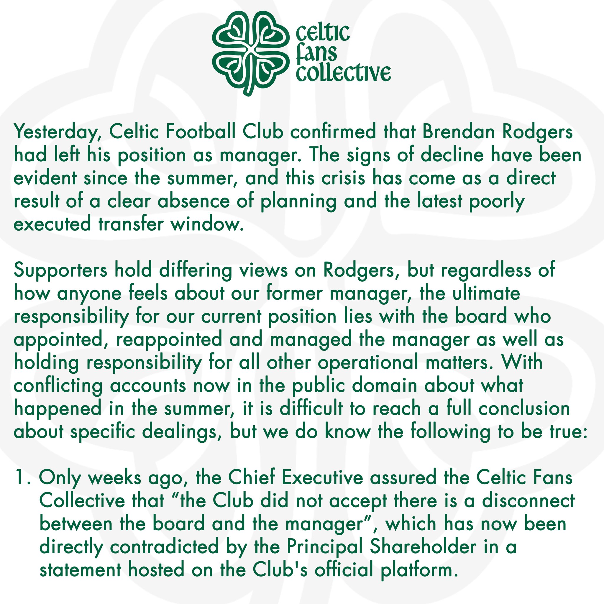 - 1. Only weeks ago, the Chief Executive assured the Celtic Fans Collective that “the Club did not accept there is a disconnect between the board and the manager”, which has now been directly contradicted by the Principal Shareholder in a statement hosted on the Club’s official platform.