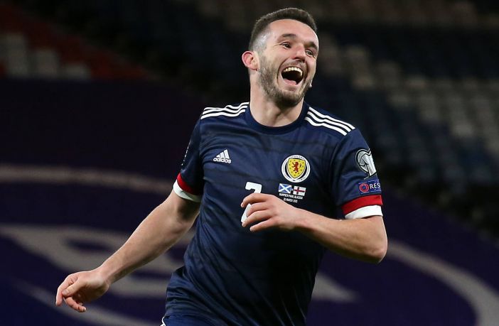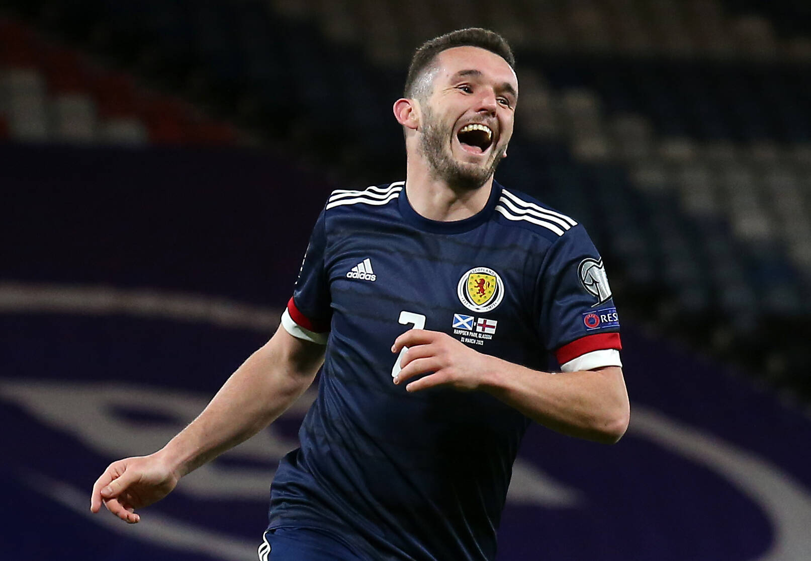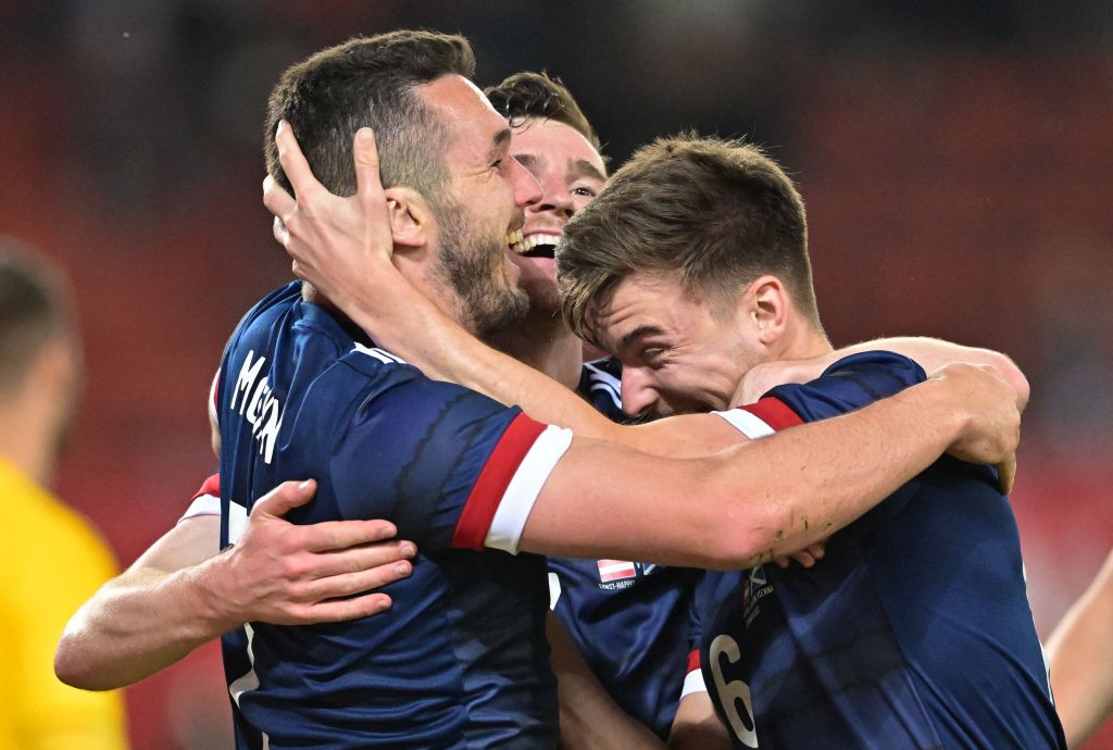 Left to right Scotland’s John McGinn,captain Andrew Robertson and Kieran Tierney celebrate after scoring during the friendly match between Austria and Scotland at Ernst Happel stadium in Vienna, Austria on March 29, 2022. (Photo by JOE KLAMAR/AFP via Getty Images)