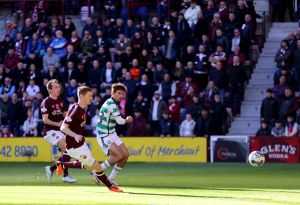 Heart of Midlothian v Celtic – cinch Premiership – Tynecastle Park Celtic s Matt O Riley scores their side s first goal of the game during the cinch Premiership match at Tynecastle Park, Edinburgh. Picture date: Sunday October 22, 2023. Use subject to restrictions. Editorial use only, no commercial use without prior consent from rights holder. PUBLICATIONxNOTxINxUKxIRL Copyright: xStevexWelshx 74258803