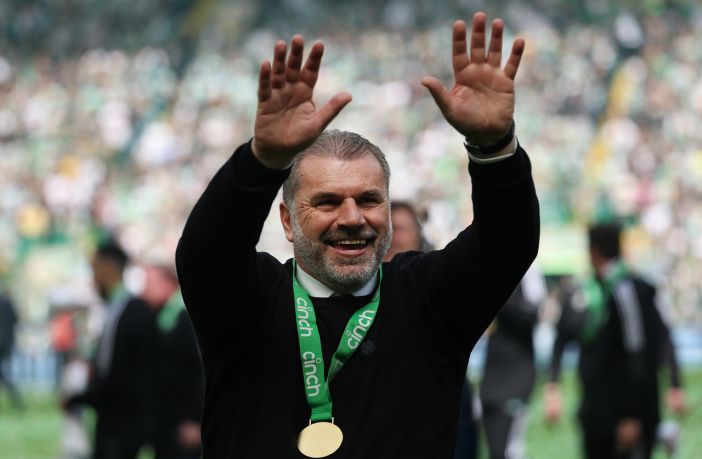 Celtic manager Ange Postecoglou celebrates at full time during the Cinch Scottish Premiership match between Dundee United and Celtic at Tannadice Park on May 11, 2022 in Dundee, Scotland. (Photo by Ian MacNicol/Getty Images)