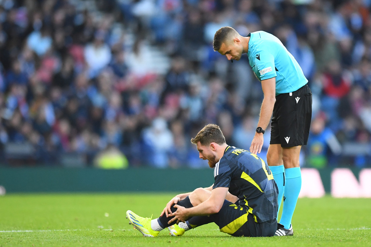 Scotland’s defender Anthony Ralston reacts after picking up a knock during the international friendly football match between Scotland and Finland, at Hampden Park in Glasgow, on June 7, 2024. (Photo by ANDY BUCHANAN/AFP via Getty Images)