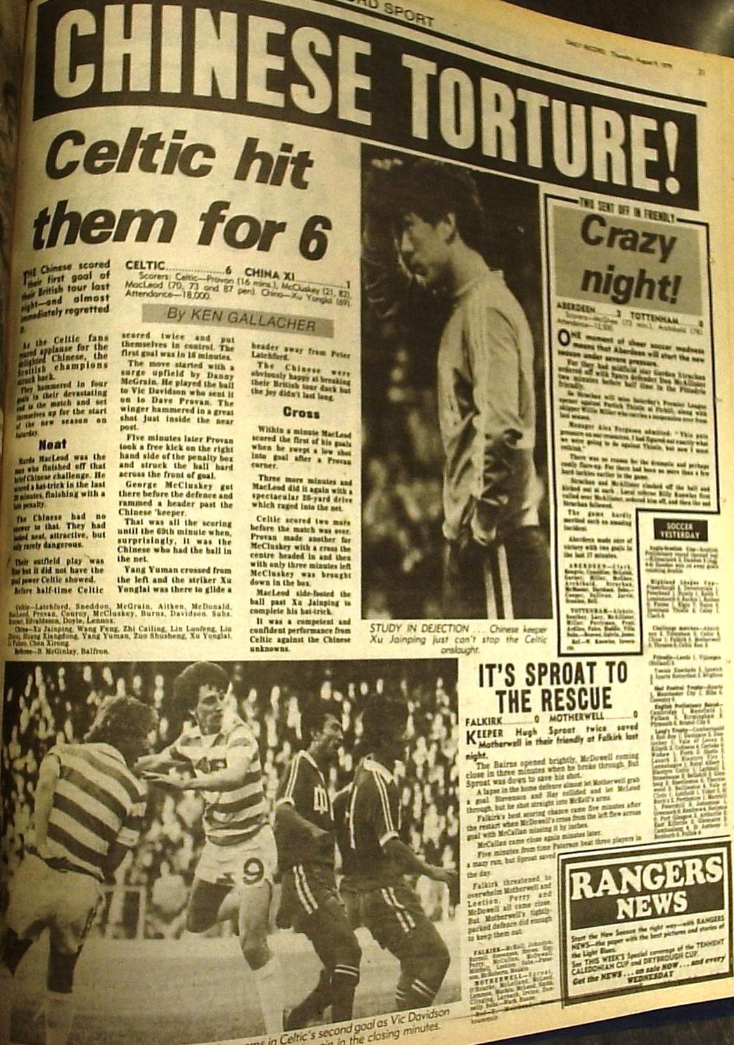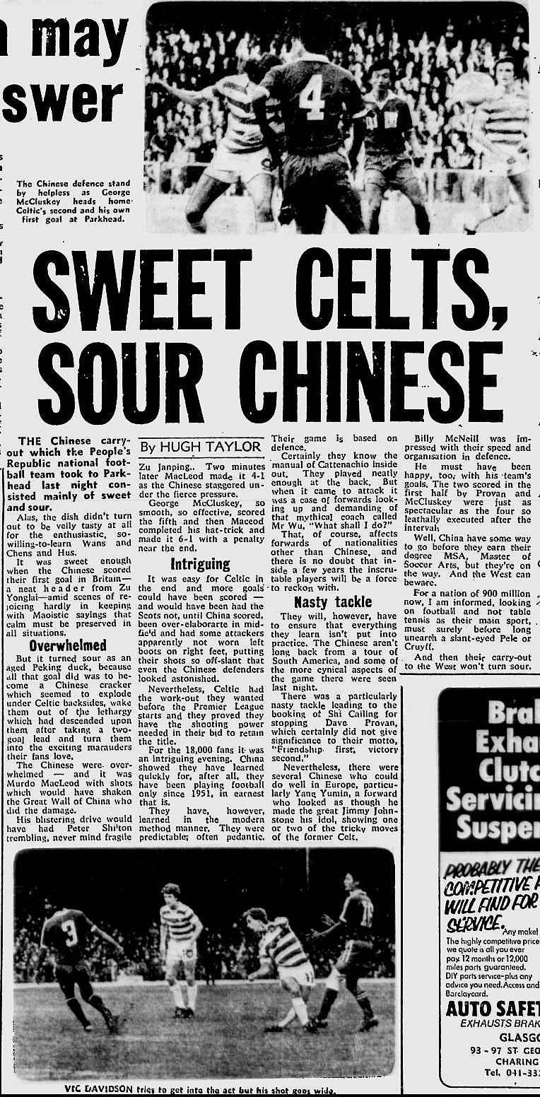 Here are some of the reports from Celtic’s 6-1 win over China, with some pretty shocking headlines which you should note were usually NOT written by the match reporter but by the sub-editors at the the papers…and also the match programme, which cost 15p, on top of the penny spent underneath the Jungle!