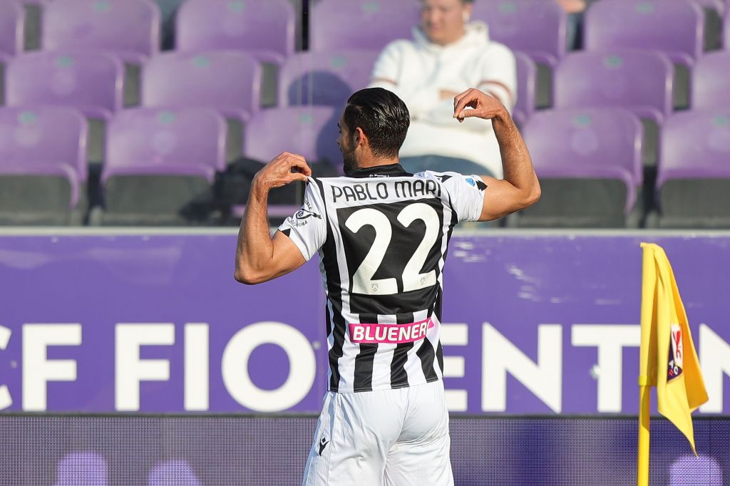 Pablo Mari’ of Udinese Calcio celebrates after scoring a goal during the Serie A match between ACF Fiorentina and Udinese Calcio at Stadio Artemio Franchi on April 27, 2022 in Florence, Italy. (Photo by Gabriele Maltinti/Getty Images)