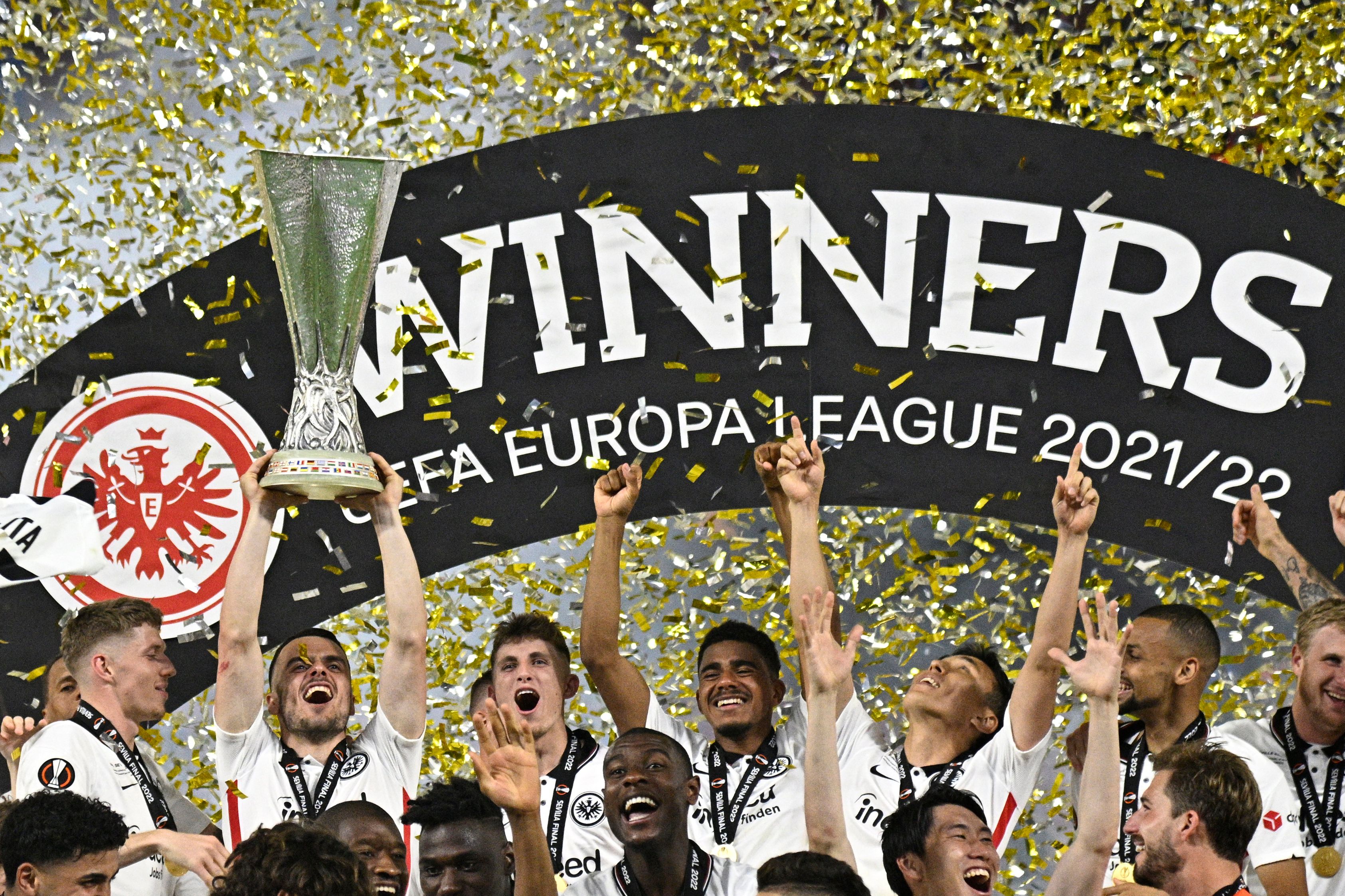 Frankfurt’s Serbian midfielder Filip Kostic lifts the trophy as Eintracht Frankfurt players celebrate after winning the UEFA Europa League final football match between Eintracht Frankfurt and Glasgow Rangers at the Ramon Sanchez Pizjuan stadium in Seville on May 18, 2022. (Photo by JAVIER SORIANO/AFP via Getty Images)