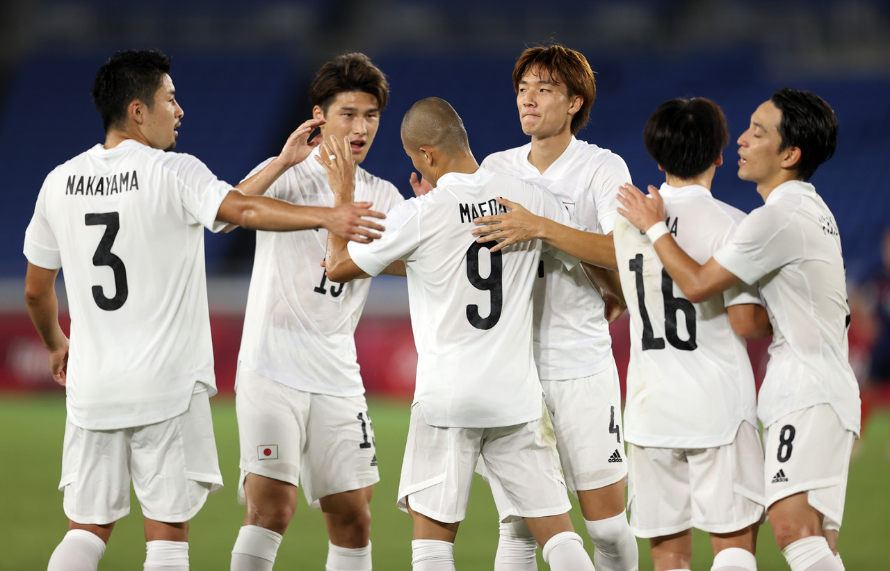 Daizen Maeda #9 of Team Japan celebrates with Kou Itakura #4 and teammates after scoring their side’s fourth goal during the Men’s Group A match between France and Japan on day five of the Tokyo 2020 Olympic Games at International Stadium Yokohama on July 28, 2021 in Yokohama, Kanagawa, Japan. (Photo by Francois Nel/Getty Images)