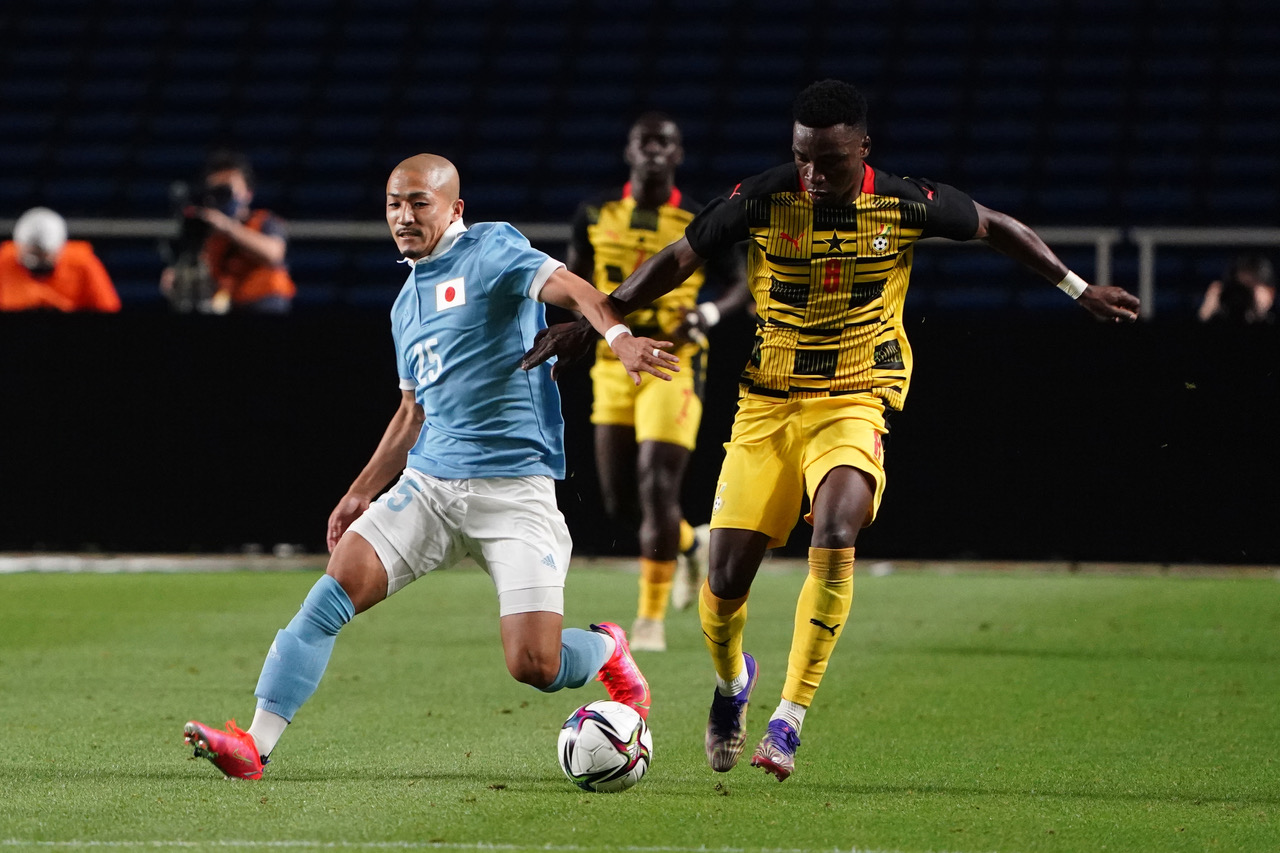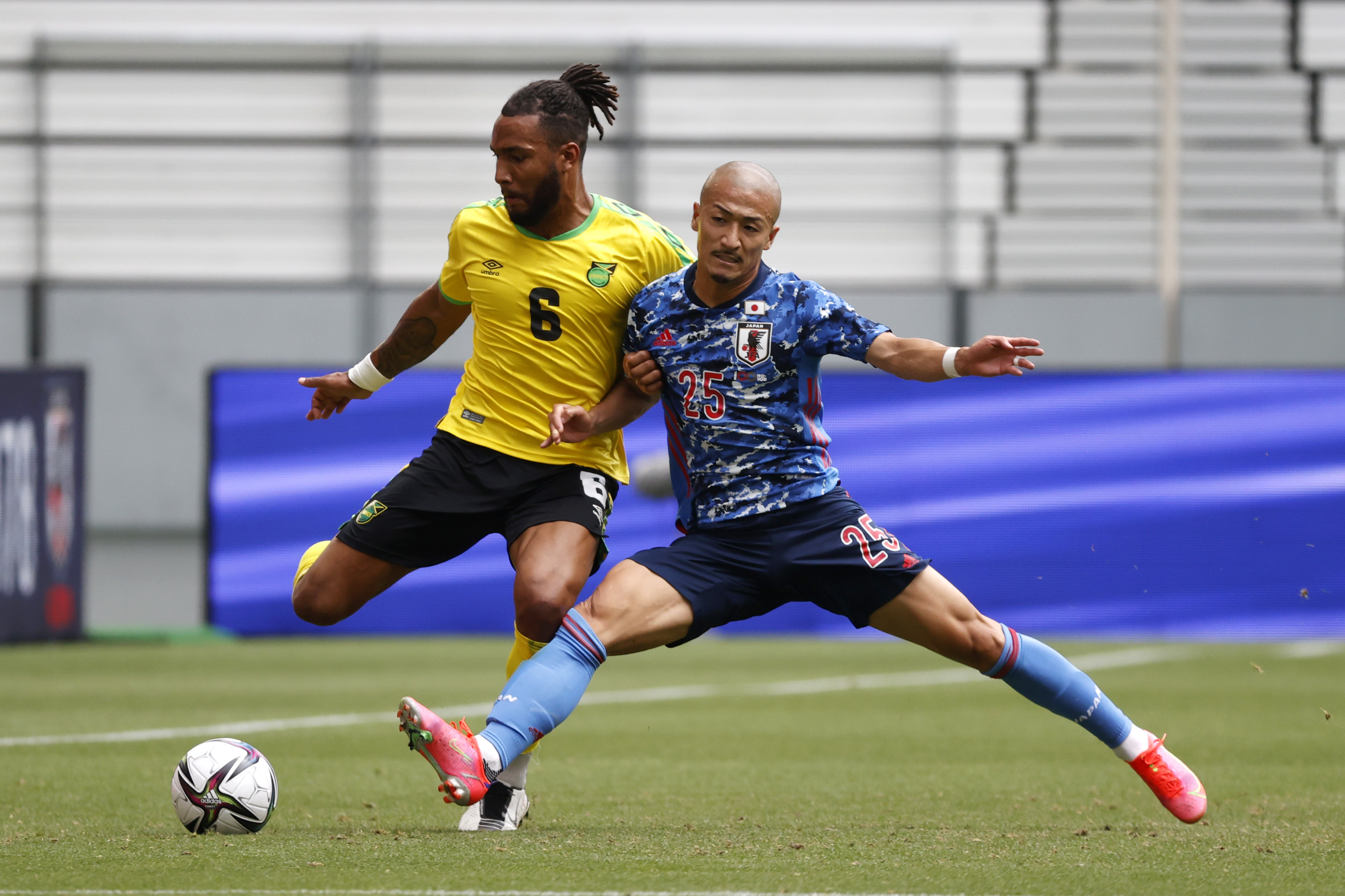 Liam Moore of Jamaica and Daizen Maeda of Japan U-24 compete for the ball during the international friendly match between Japan U-24 and Jamaica at the Toyota Stadium on June 12, 2021 in Toyota, Aichi, Japan. (Photo by Toru Hanai/Getty Images)