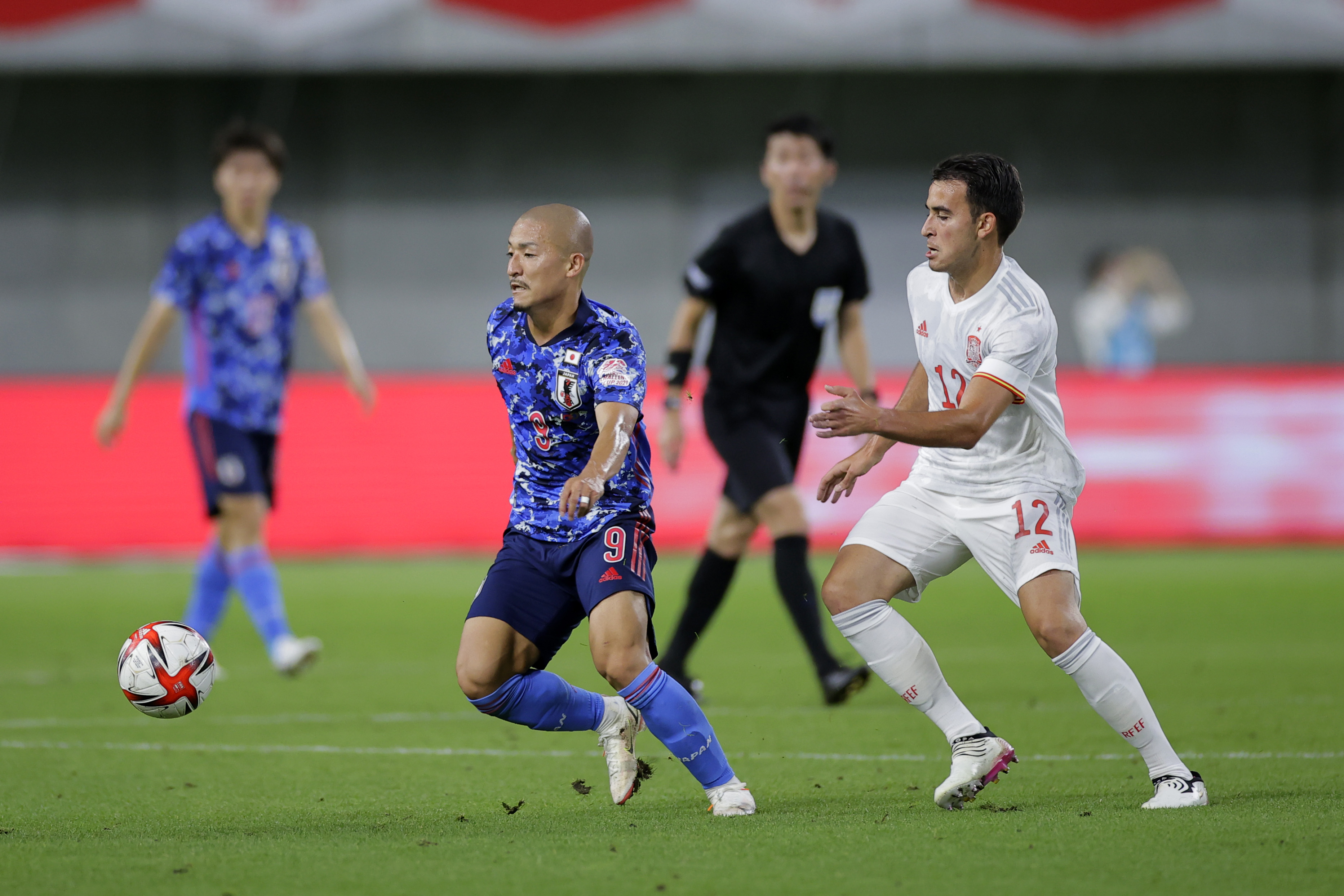 Daizen Maeda of Japan controls the ball under pressure of Eric Garcia of Spain during the U-24 international friendly match between Japan and Spain at the Noevir Stadium Kobe on July 17, 2021 in kobe, Hyogo, Japan. (Photo by Koki Nagahama/Getty Images)