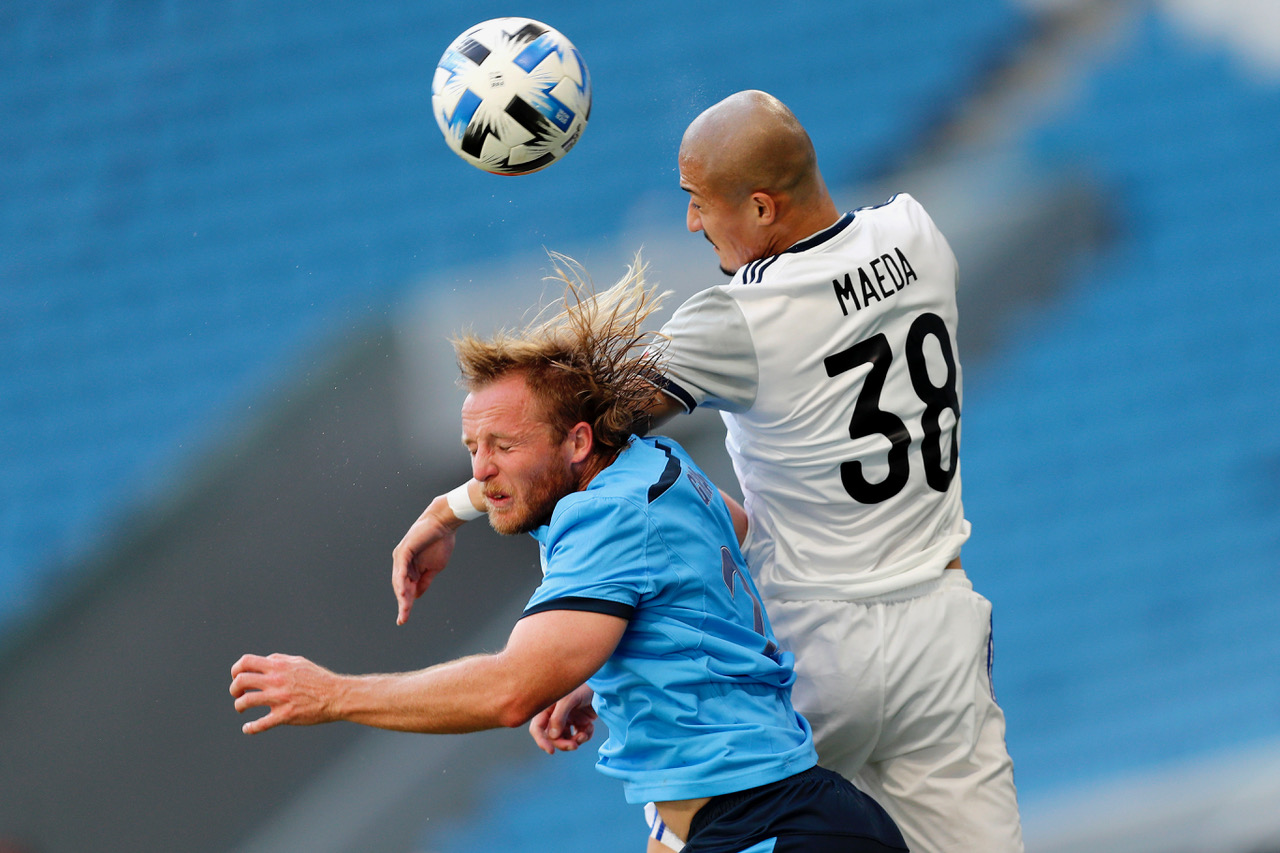 Rhyan Grant of Sydney FC and Daizen Maeda of Yokohama F.Marinos compete for the ball during the AFC Champions League Group H match between Sydney FC and Yokohama F.Marinos at the Al Janoub Stadium on December 4, 2020 in Al Wakrah, Qatar. (Photo by Mohamed Farag/Getty Images)