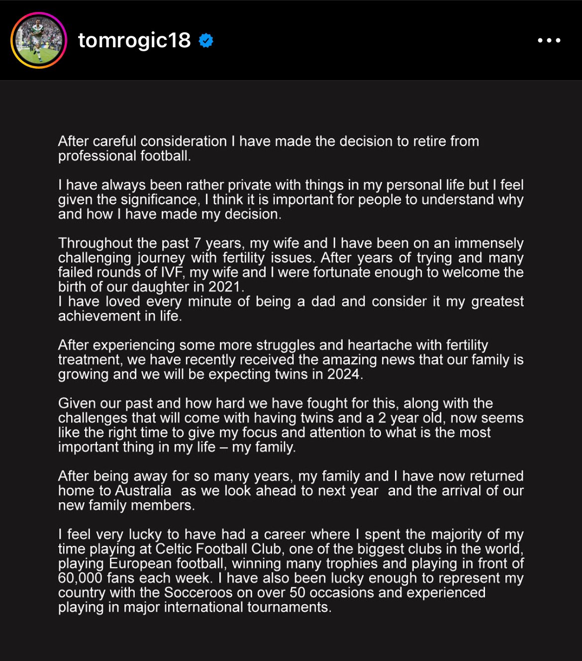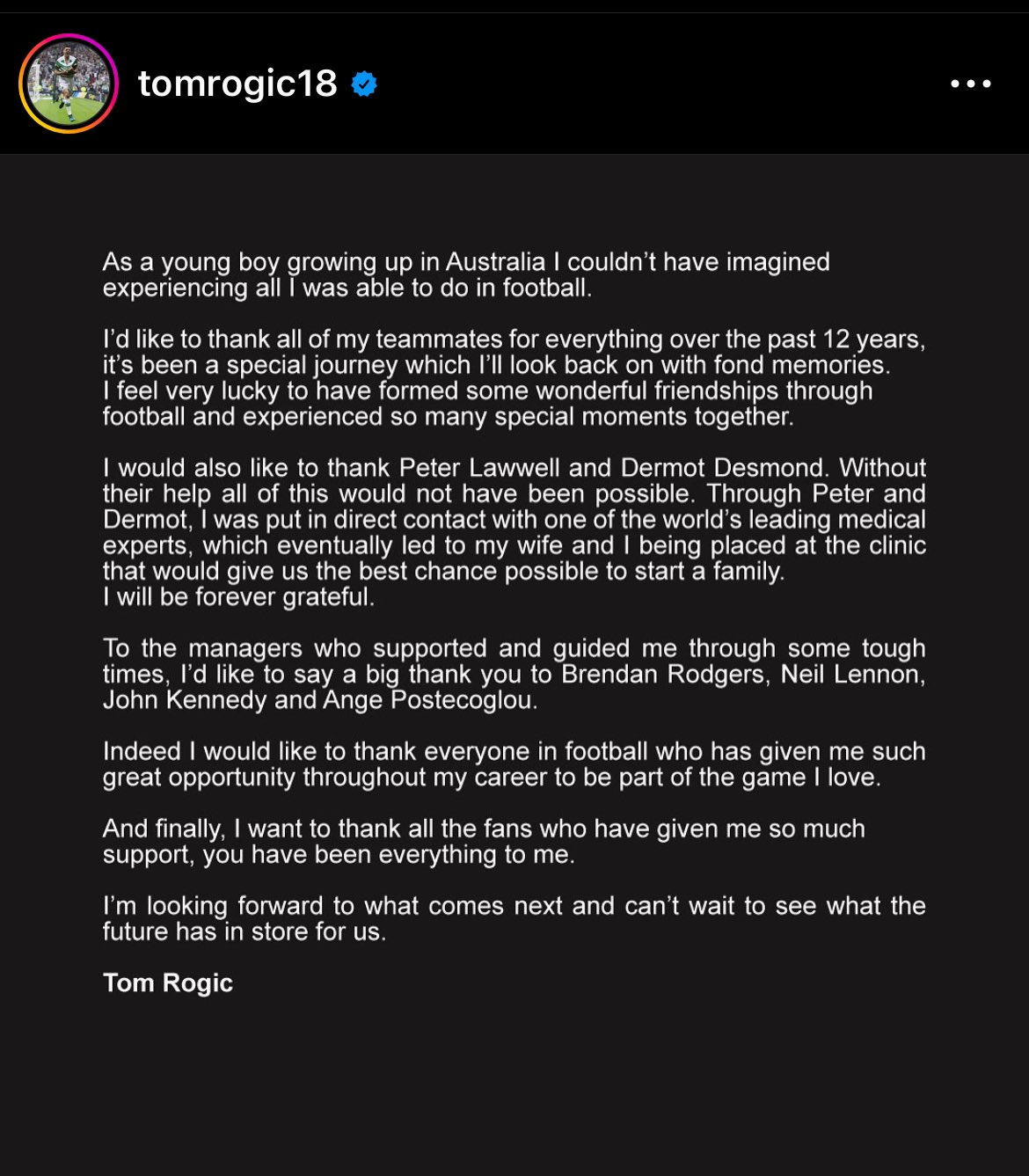 Brendan Rodgers this afternoon reacted to the news this morning that Tom Rogic had taken the tough decision to call time his playing career in order to spend time with his family with the former Celtic legend explaining the personal details which revealed the struggles that Tom and his wife have had to endure and also the beautiful happy ending as the Rogic family is set to double in numbers next year.