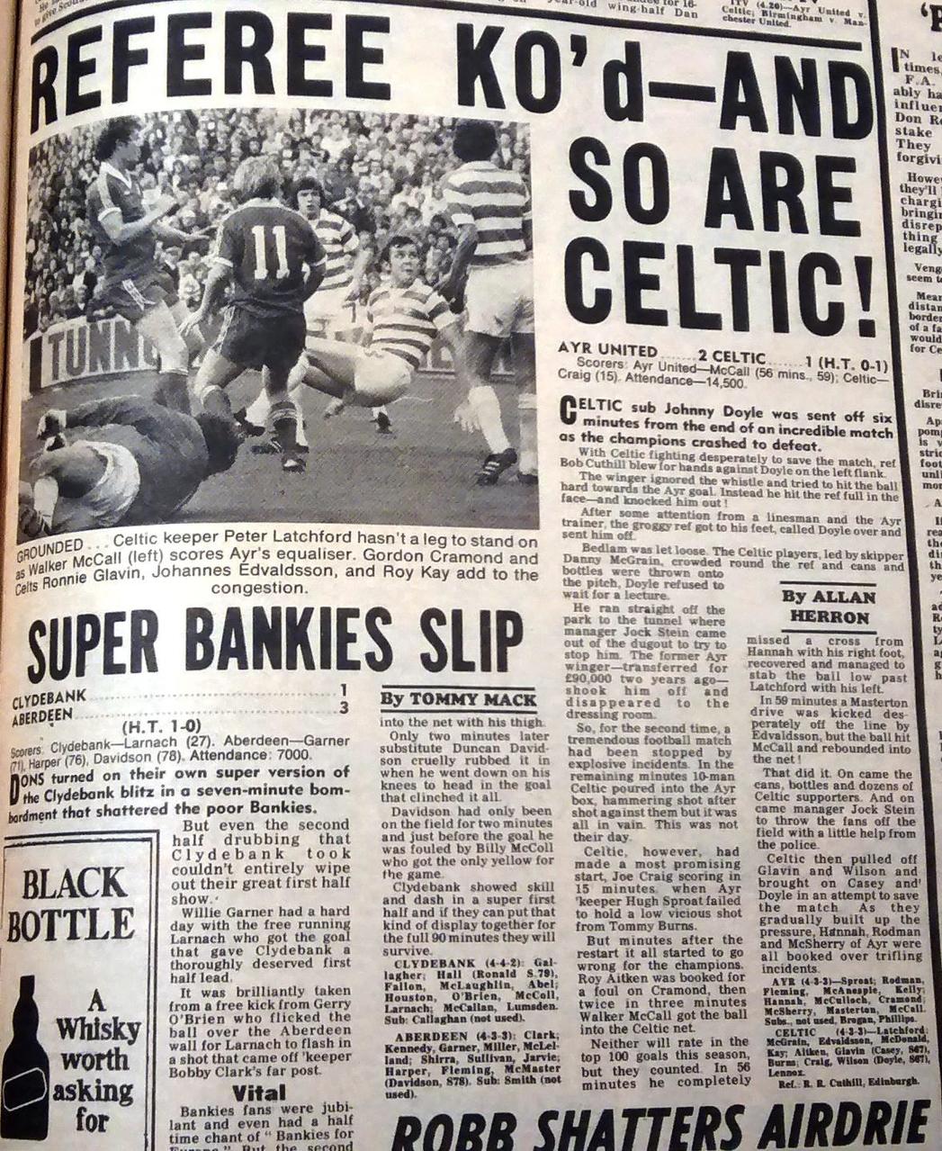 The ordering off was later rescinded and no suspension given, but nothing could be done about the result which remained Ayr United 2 Celtic 1. Coming as this did only ten days after the Dalglish transfer, it was another massive blow to the beleaguered Celtic support.