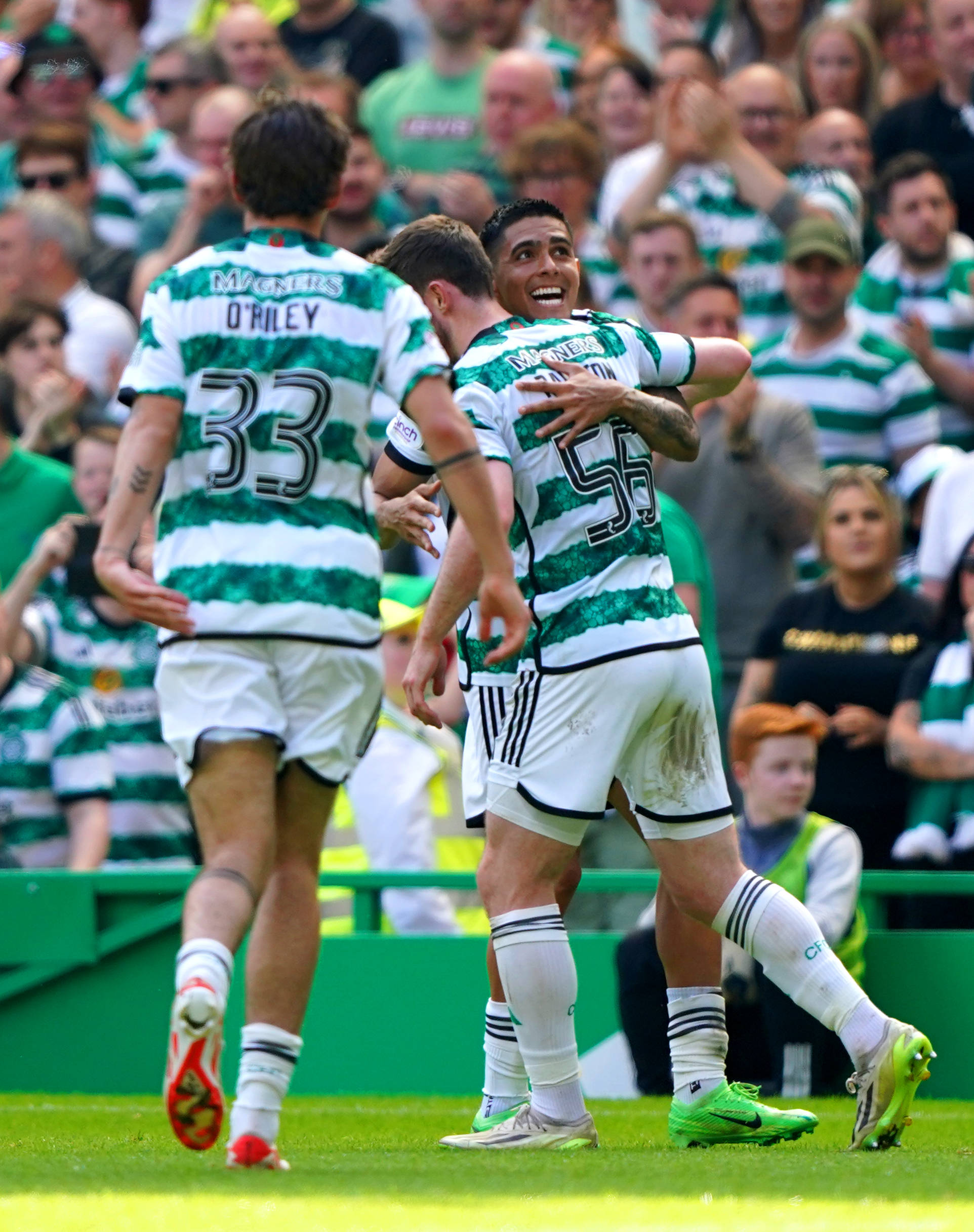 Celtic v St Mirren – Luis Palma right celebrates with Anthony Ralston after scoring the winning goal during the Scottish Premiership match at Celtic Park on Saturday May 18, 2024. Photo Andrew Milligan