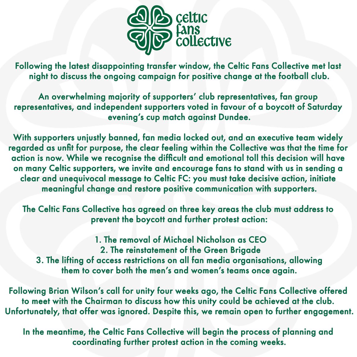 “Following the latest disappointing transfer window, the Celtic Fans Collective met last night to discuss the ongoing campaign for positive change at the football club.