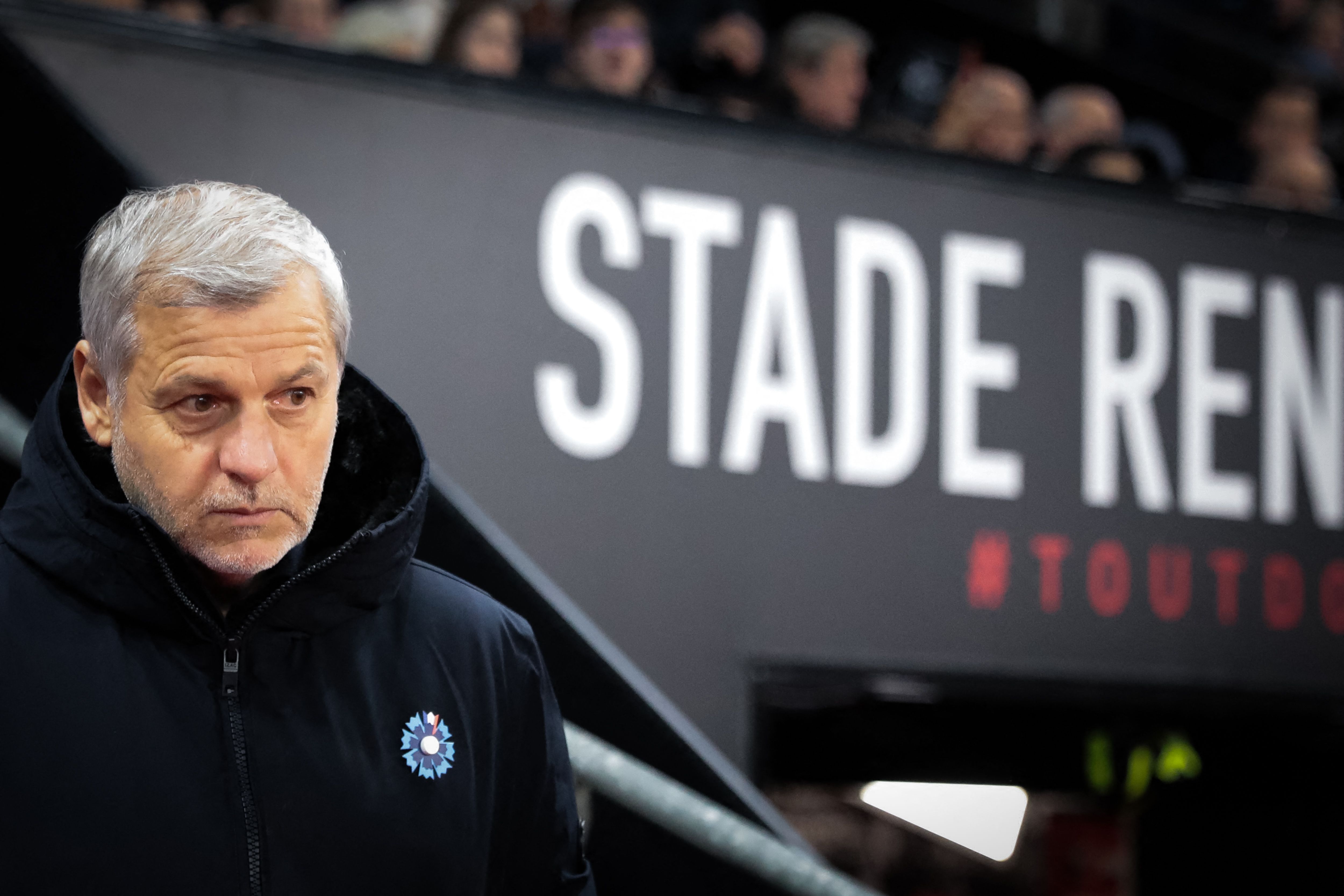 Rennes’ French head coach Bruno Genesio looks on during the French L1 football match between Stade Rennais FC (Rennes) and Toulouse FC at the Roazhon Park stadium in Rennes on November 12, 2022. (Photo by LOU BENOIST/AFP via Getty Images)