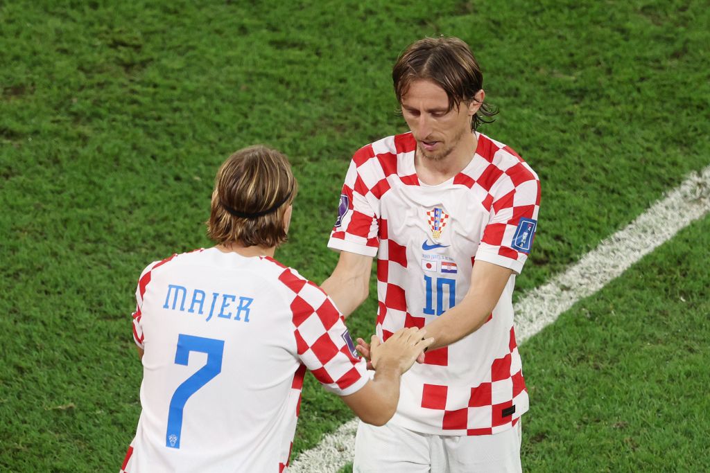AL WAKRAH, QATAR – DECEMBER 05: Lovro Majer (L) replaces Luka Modric of Croatia during the FIFA World Cup Qatar 2022 Round of 16 match between Japan and Croatia at Al Janoub Stadium on December 05, 2022 in Al Wakrah, Qatar. (Photo by Clive Brunskill/Getty Images)