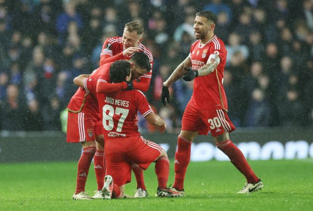 Rafa of SL Benfica celebrates scoring his team’s first goal with teammates during the UEFA Europa League 2023/24 round of 16 second leg match between theRangers and SL Benfica at Ibrox on March 14, 2024. (Photo by Ian MacNicol/Getty Images)