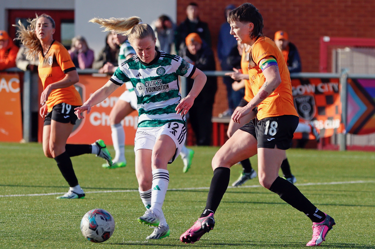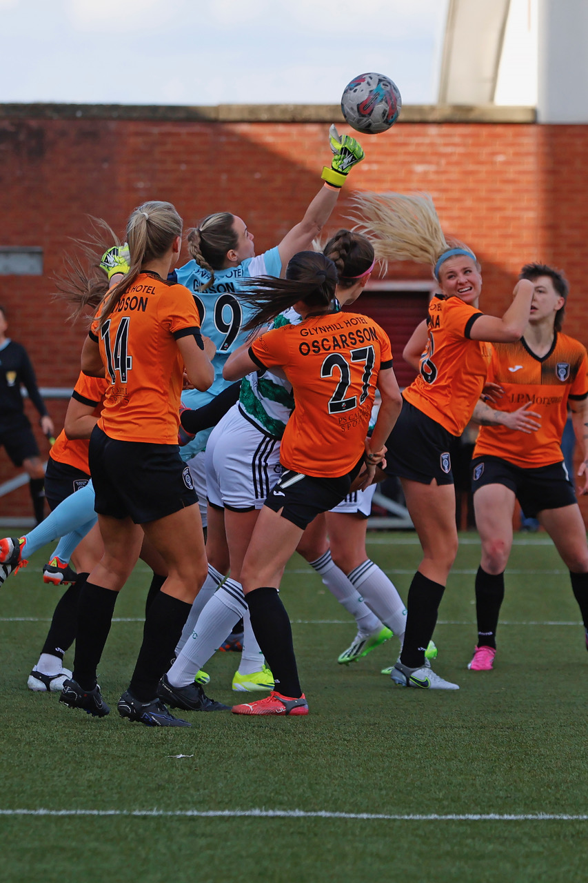 We almost had a third as Amy Gallacher’s first-time shot forced goalkeeper Lee Gibson into a brilliant save. And up the other end of the pitch, our defence did well to keep City at bay as Chloe Craig, who made her 300th appearance in the Hoops today, put in a solid shift.