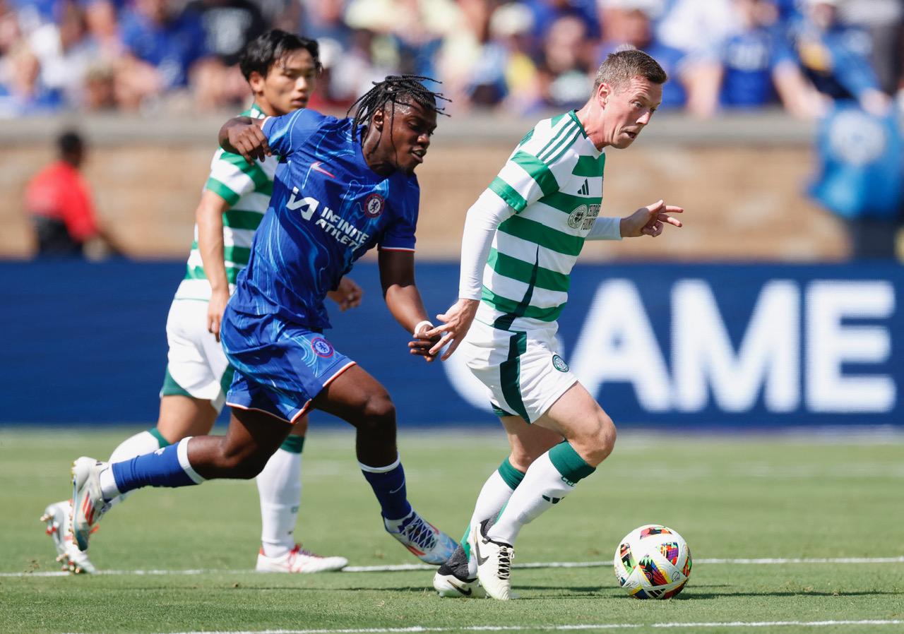 Chelsea’s Roméo Lavia fights for the ball with Celtic’s Callum McGregor during a pre-seasonl match between Chelsea and Celtic at Notre Dame Stadium in South Bend, Indiana, on July 27, 2024. (Photo by KAMIL KRZACZYNSKI/AFP via Getty Images)