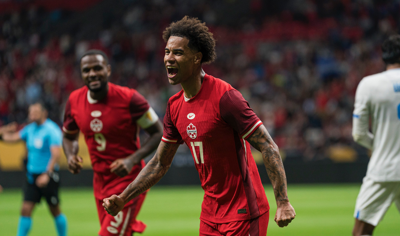 Tajon Buchanan #17 of Canada celebrates after scoring a goal in the second half against El Salvador during the Group Stage – Group B match as part of the 2025 CONCACAF Gold Cup at Shell Energy Stadium on June 24, 2025 in Houston, Texas. (Photo by Tim Warner/Getty Images)