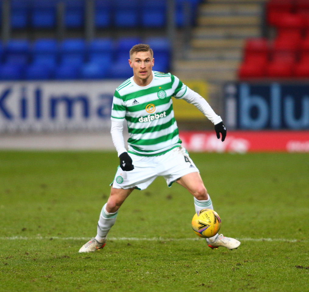 26th December 2021; McDiarmid Park, Perth, Scotland; Scottish Premier League football, St Johnstone versus Celtic; Carl Starfelt of Celtic on the ball