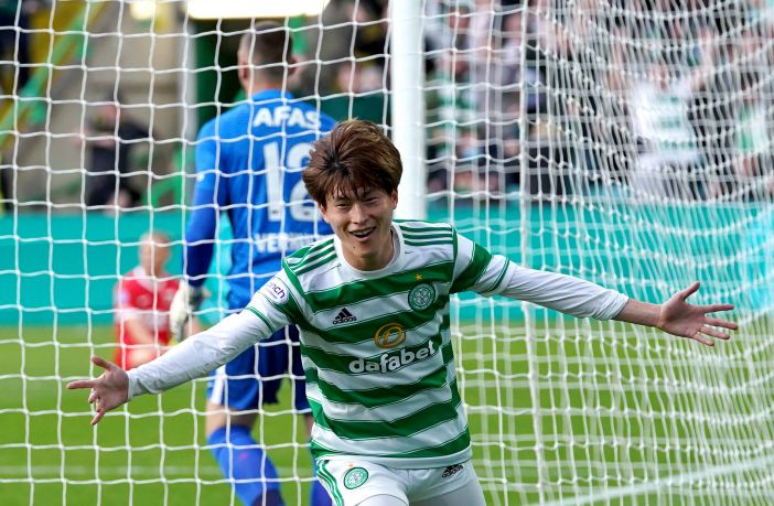 Kyogo Furuhashi rcelebrates with his team-mates after scoring the first goal of the game. Photo: Andrew Milligan
