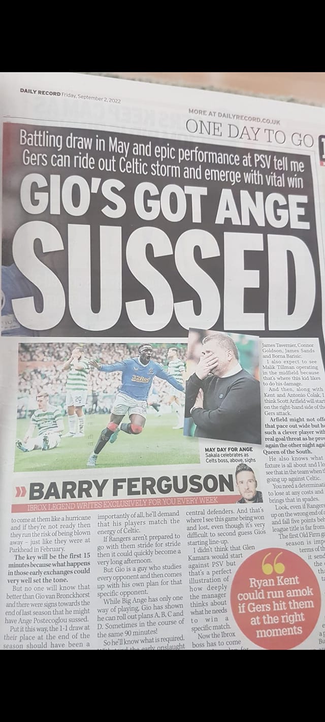 Ange’s Plan A worked quite well…Superb display from Celtic. An absolute pumping but still only 3 points. Nothing is won in September. From Rangers point of view it was rather embarrassing but at least Alfredo is easing his way back into condition…🍀