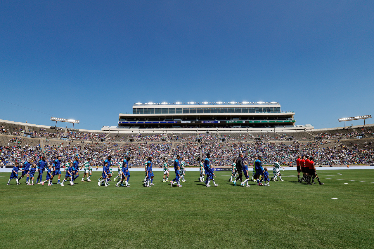 Chelsea and Celtic players walk on the field before the pre-season l match between Chelsea and Celtic at the Notre Dame Stadium in South Bend, Indiana on July 27 2024. (Photo by KAMIL KRZACZYNSKI/AFP via Getty Images)
