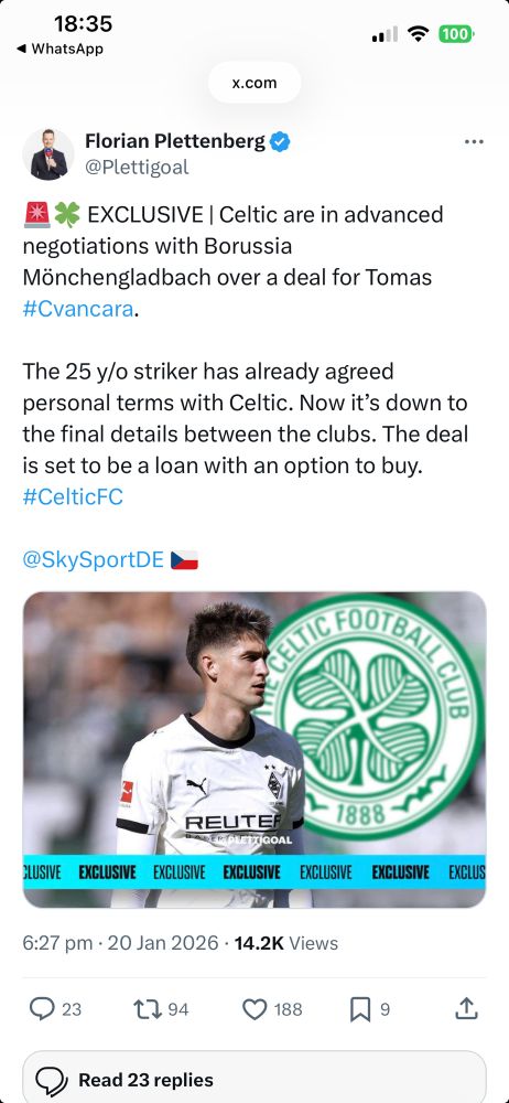 ‘Celtic are in advanced negotiations with Borussia Mönchengladbach over a deal for Tomas Cvancara. The 25 year-old striker has already agreed personal terms with Celtic. Now it’s down to the final details between the clubs. The deal is set to be a loan with an option to buy.’