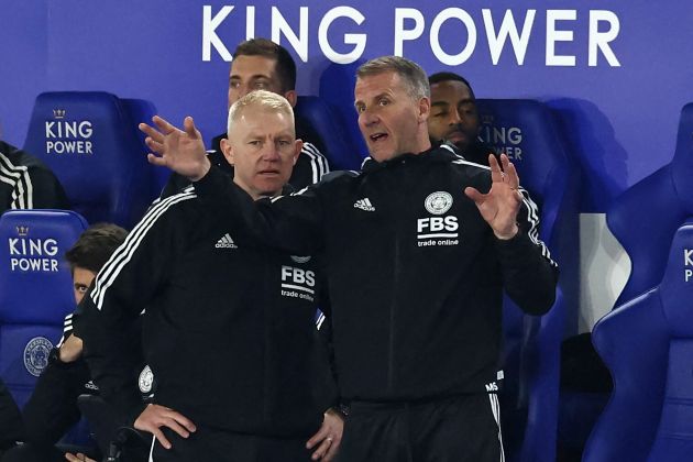 Leicester City’s first team coach Adam Sadler (L) and Leicester City’s first team coach Mike Stowell (R) discuss tactics during the English Premier League football match between Leicester City and Aston Villa at King Power Stadium on April 4, 2023. (Photo by DARREN STAPLES/AFP via Getty Images)