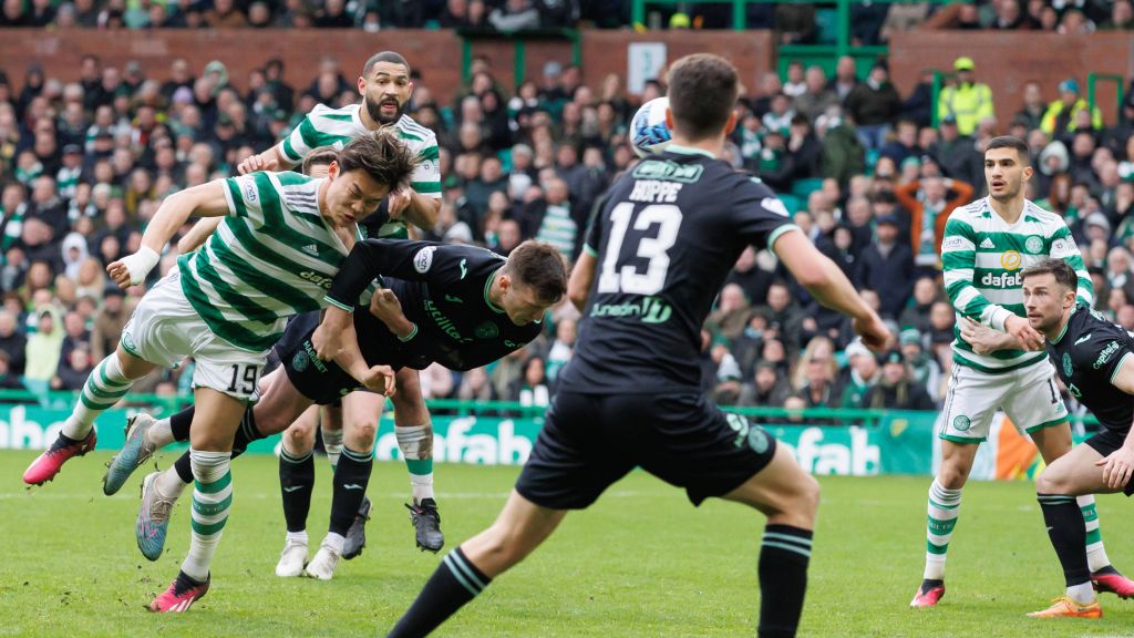Hyeongyu Oh scores our second goal during the cinch Premiership match against Hibs at Celtic Park, on Saturday March 18, 2023. Photo Steve Welsh