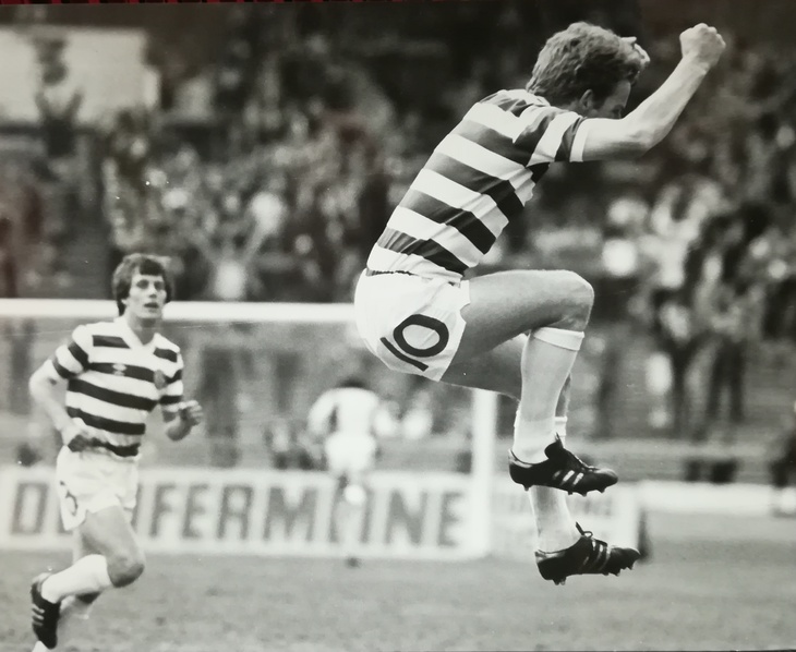 On Danny McGrain’s 32nd birthday, his great friend Tommy Burns got the party started after fifteen minutes, with a goal-of-the-season contender, twisting and turning before smashing the ball high past a bewildered McArthur in the Hibs goal. Three minutes later, man-of-the-moment Crainie kept his own tremendous scoring run going with an opportunist second.