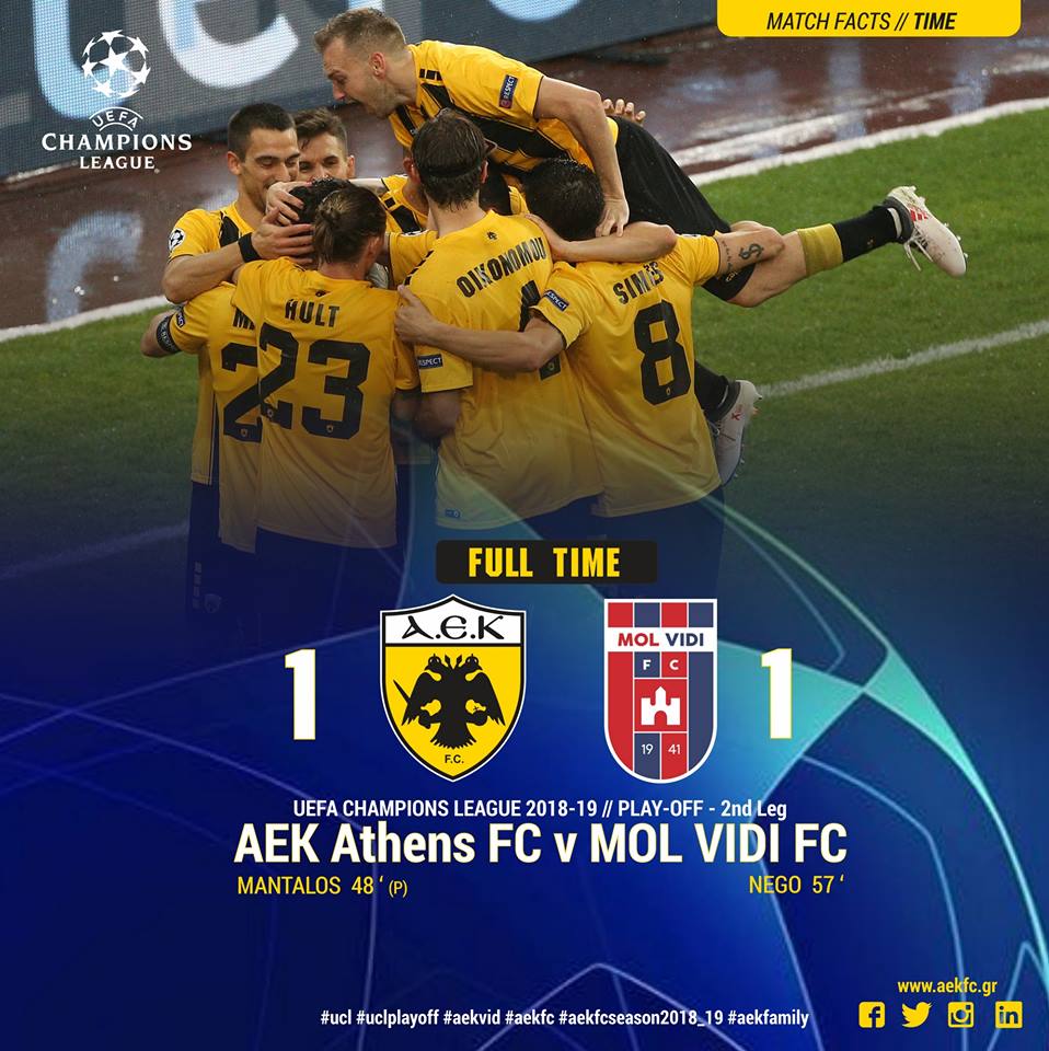 They went ahead through a penalty tonight scored by their captain, Mantalos . Vidi levelled the score on the night shortly afterwards through Nego and AEK then got a player sent off for putting his head into the back of an opponent’s head right in front of the referee.