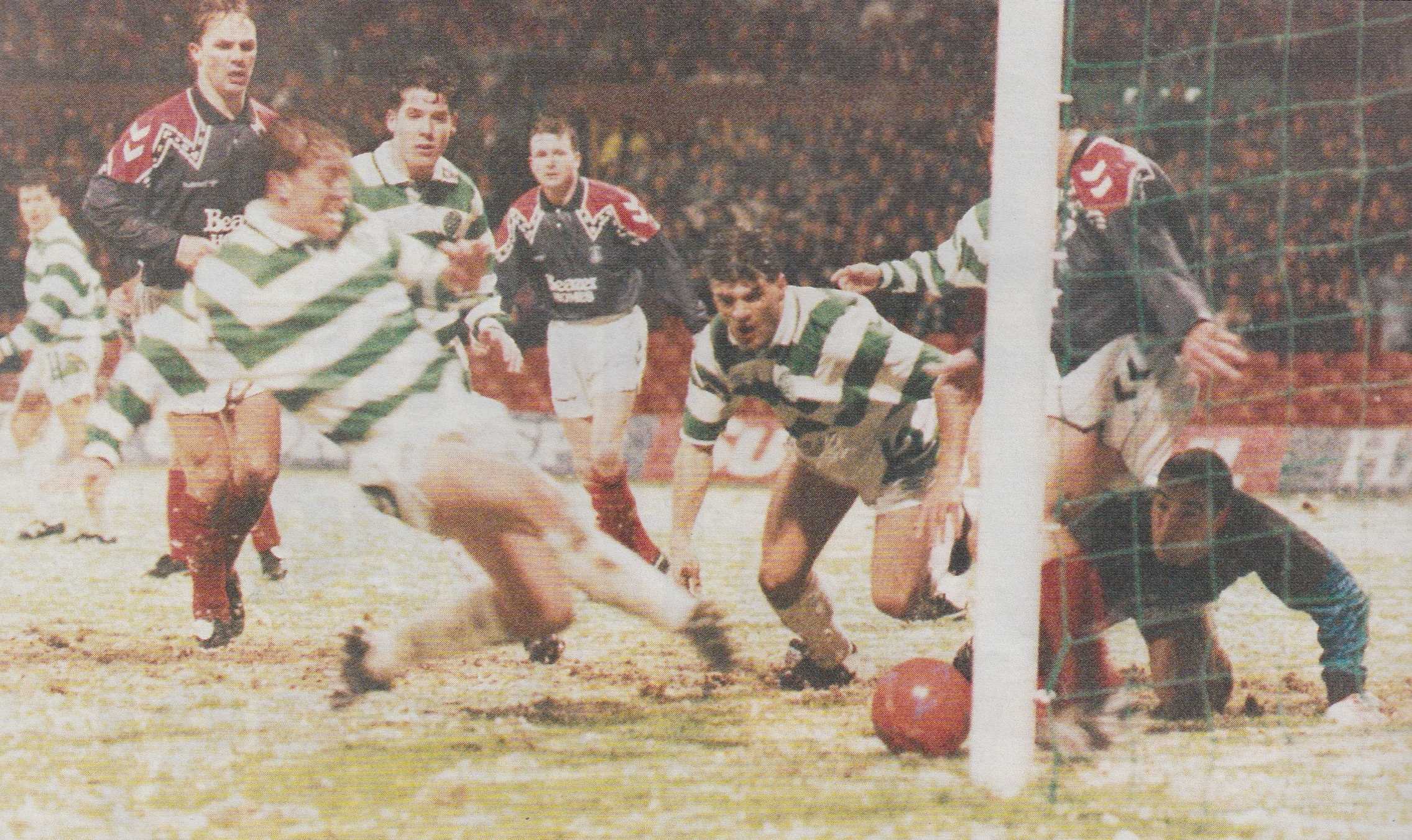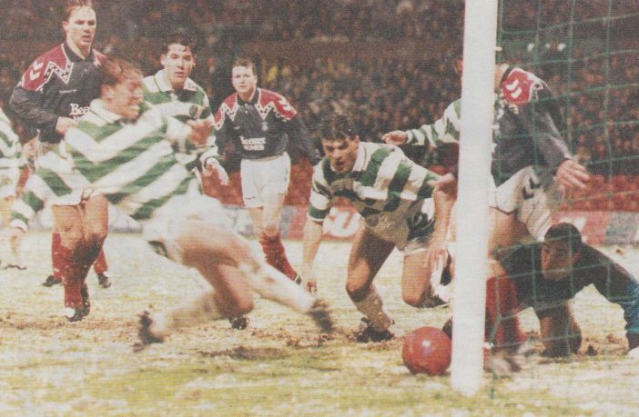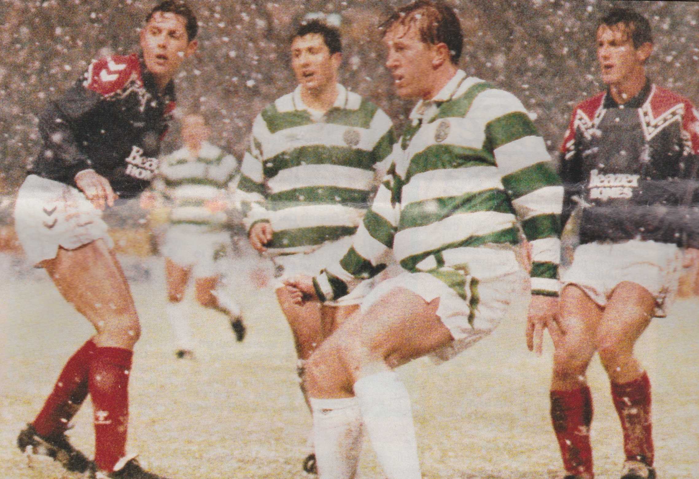 But its appearance turned out to be a good luck charm as Gerry Creaney soon equalised for Celtic. The snow didn’t let up but that didn’t deter the Celtic players who continuously bombarded the Falkirk goal the entire second half in search of a winner, but to no avail.