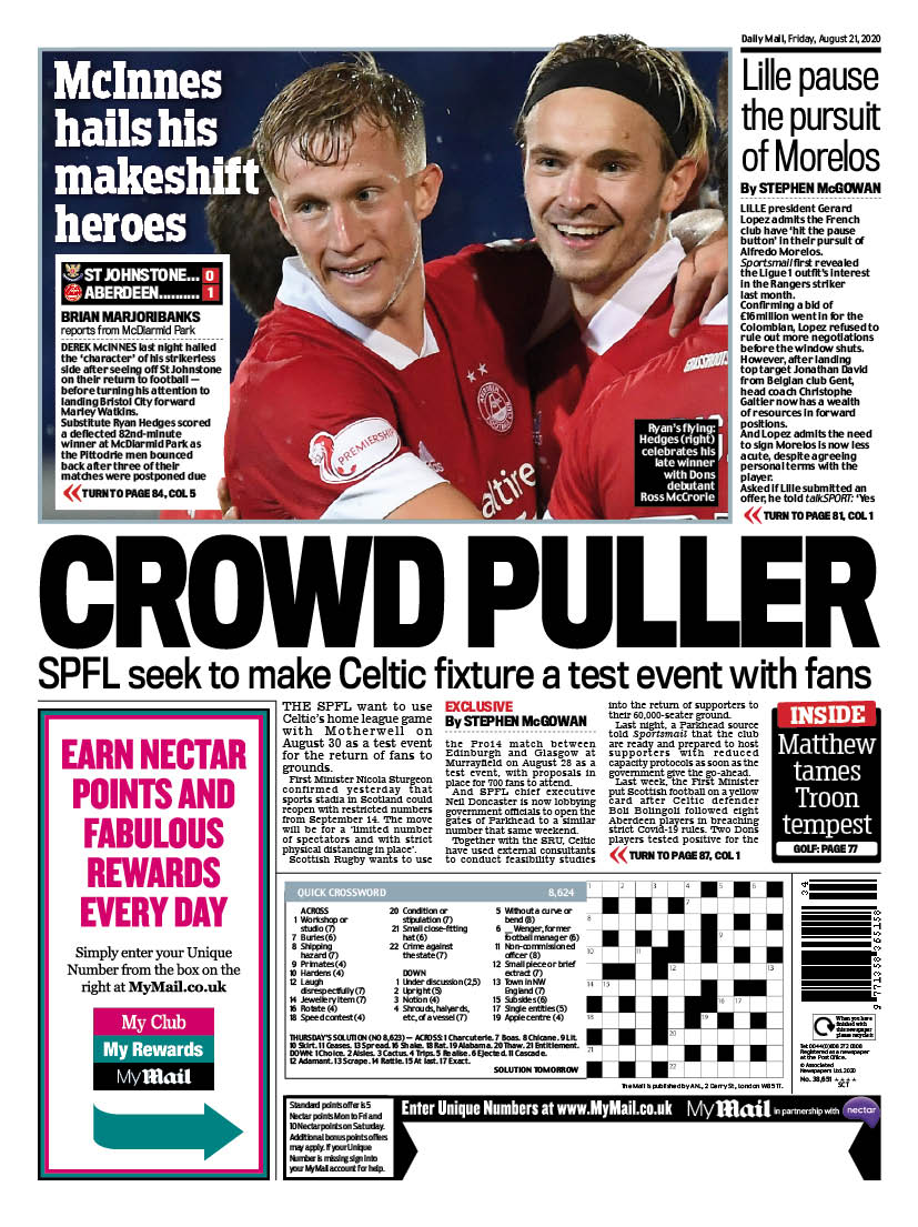 First Minister Nicola Sturgeon yesterday gave the green light to resuming sports events with spectators from the middle of next month but a trial in the Celtic v Motherwell game next Sunday – the game was recently pushed back 24 hours to accommodate Motherwell’s Europa League qualifier next week – now looks like going ahead.