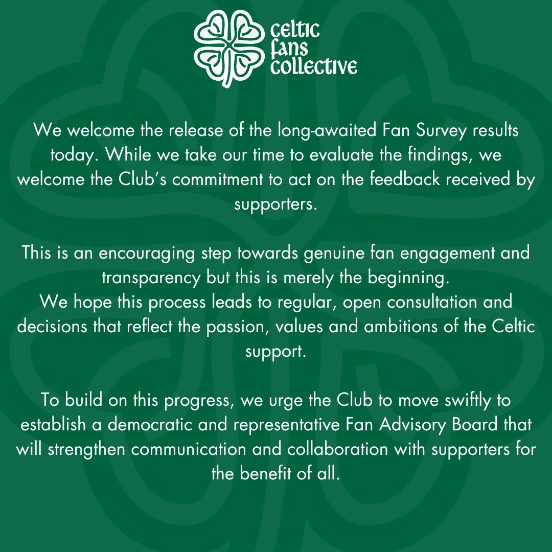 The Celtic Fans Collective have called on the club to establish a Fan Advisory Board after Celtic released the long awaited Fan Survey. The group commended Celtic for releasing the results and their commitment to improve fan engagement.
