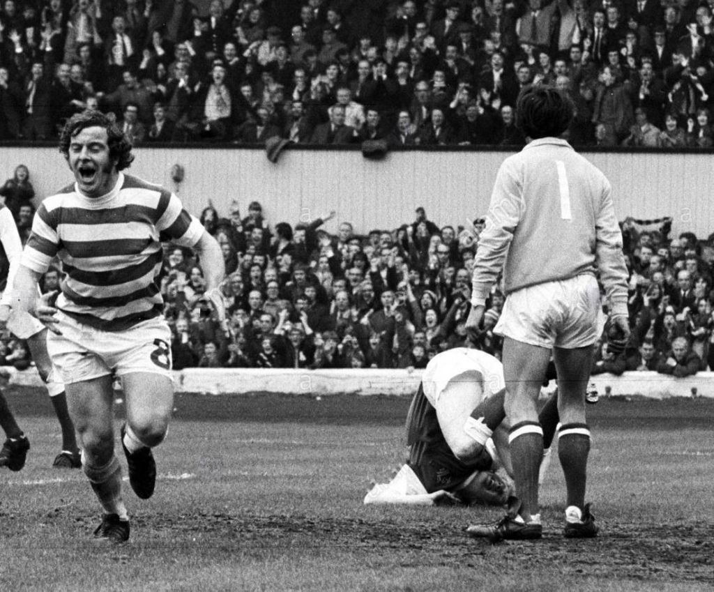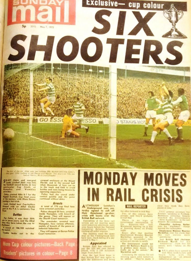 The opposition were Hibs who had had a good season, and it was often said that Celtic played their best football against Hibs. So it turned out to-day. McNeill scored first, Deans then scored his hat-trick (his second goal and Celtic’s third being a sight to behold) before Lou Macari scored another two to confirm Celtic’s 22nd Scottish Cup victory. Ex Celt Bertie Auld came on as a substitute for Hibs.