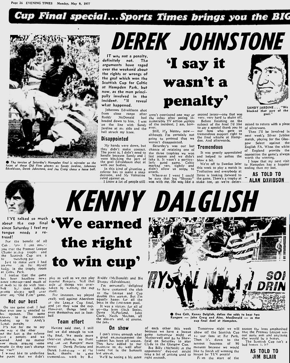 The Celtic team was: Latchford, McGrain, Lynch, Stanton, MacDonald, Aitken, Dalglish, Edvaldsson, Craig, Wilson, Conn. Scorer:- Lynch pen (20)
