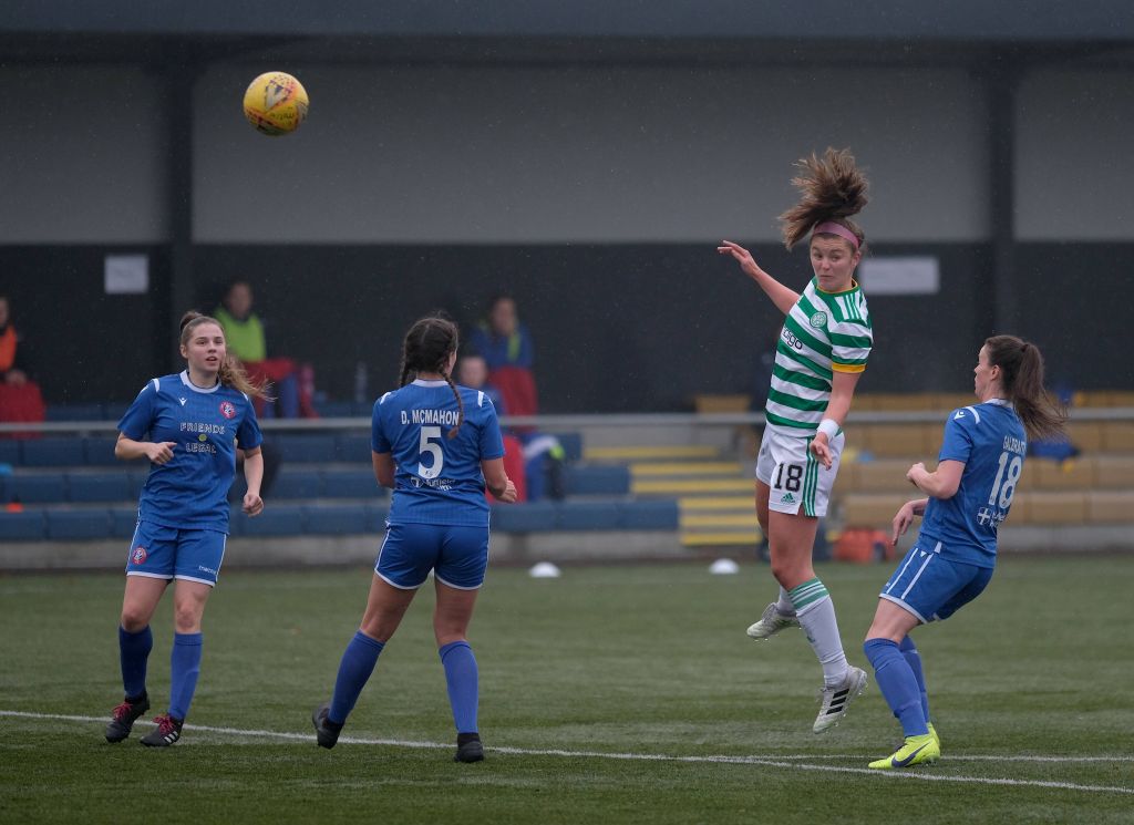 Head Ghirl Caitlin Hayes wins a header during the Celtic v Spartans match earlier this season. Photo: Alex Todd/SPP