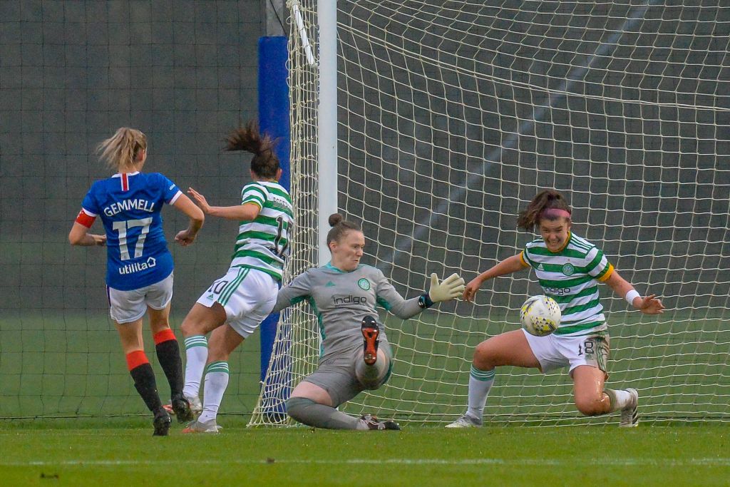 The Rangers shot is blocked on the line by Caitlin Hayes during Celtic’s win at theRangers Training Centre back in November. Photo: Malcolm Mackenzie