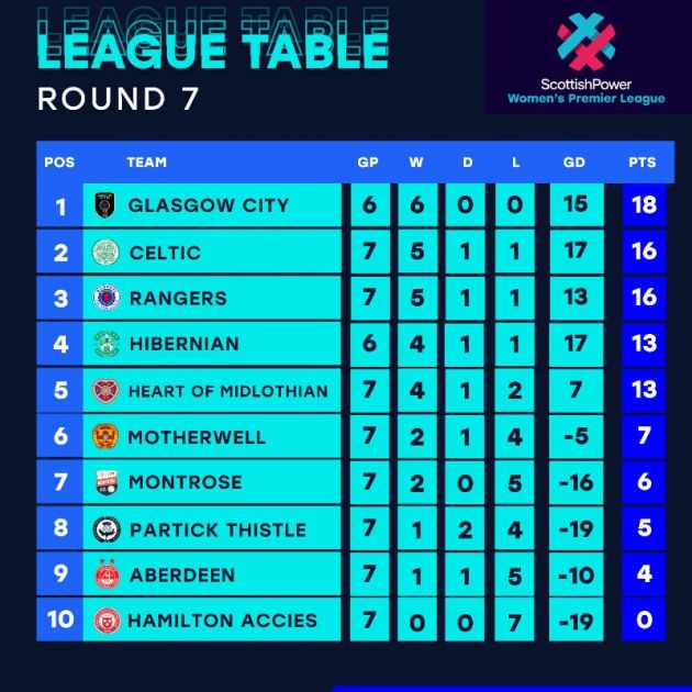 With Glasgow City beating theRangers 1-0 at Ibrox it means that Celtic leapfrog theRangers to go into second place on goal difference with Glasgow City now two points clear with a game in hand. Current Champions Hibs won 5-0 at Hamilton this afternoon and three points behind Celtic and theRangers also with a game in hand, like City due to European commitments.