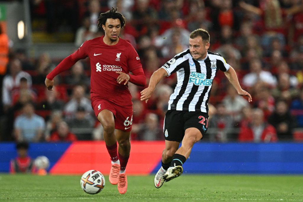 Ryan Fraser (R) vies with Trent Alexander-Arnold (L) during the English Premier League match between Liverpool and Newcastle United at Anfield in Liverpool, on August 31, 2022. (Photo by PAUL ELLIS/AFP via Getty Images)